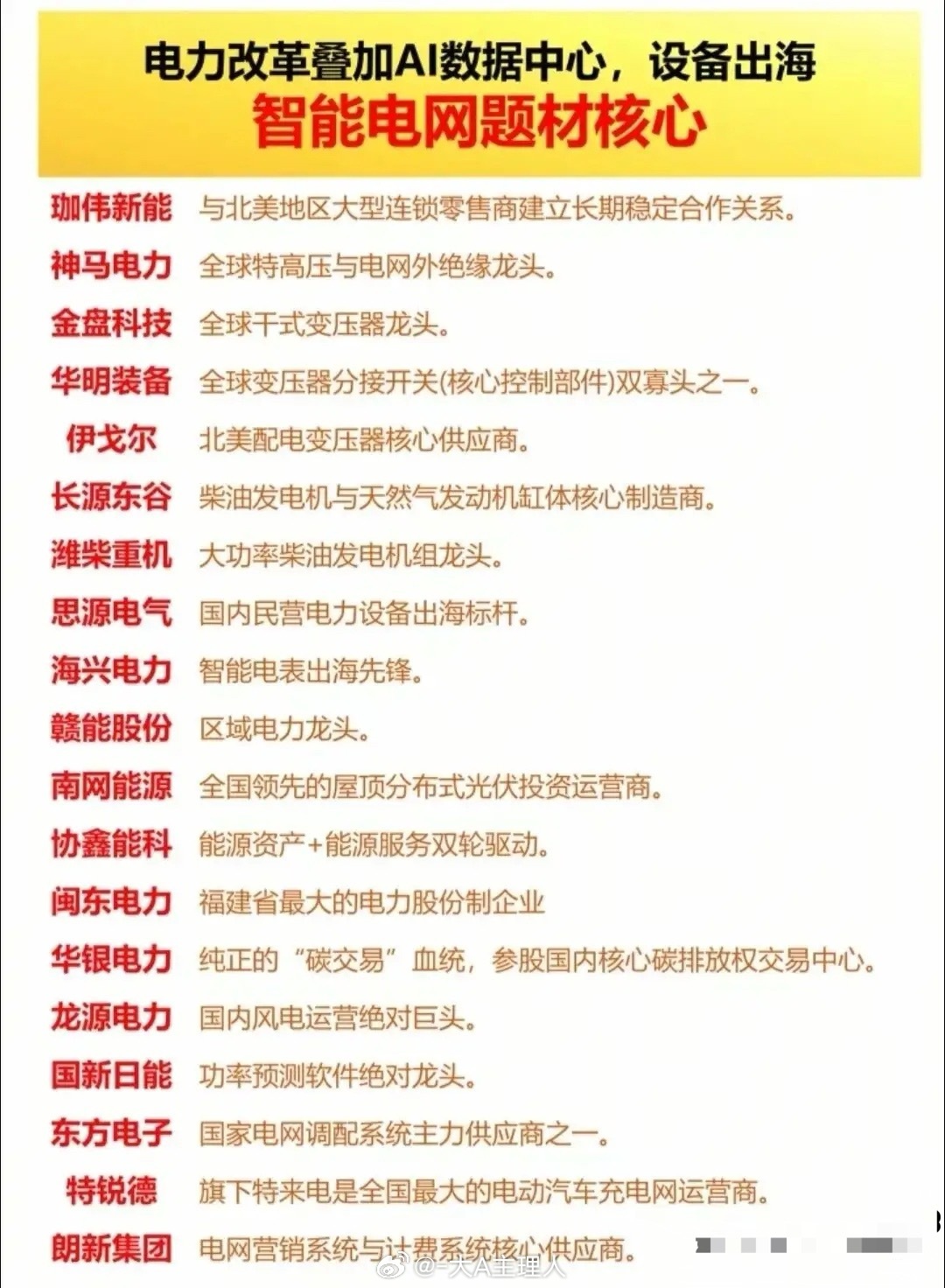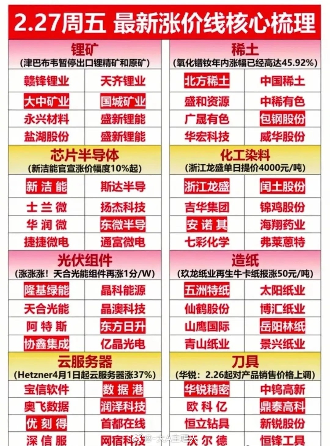周五小金属板块强势爆发,稀土、钨、锂等现货价节后再创新高,核心龙头名单已整理;智能电网乘势而上,电力改革叠加AI数据中心,设备出海加速;锂矿、芯片半导体、光伏组件、云服务器等多赛道集体提价,涨价线核心标的全梳理。