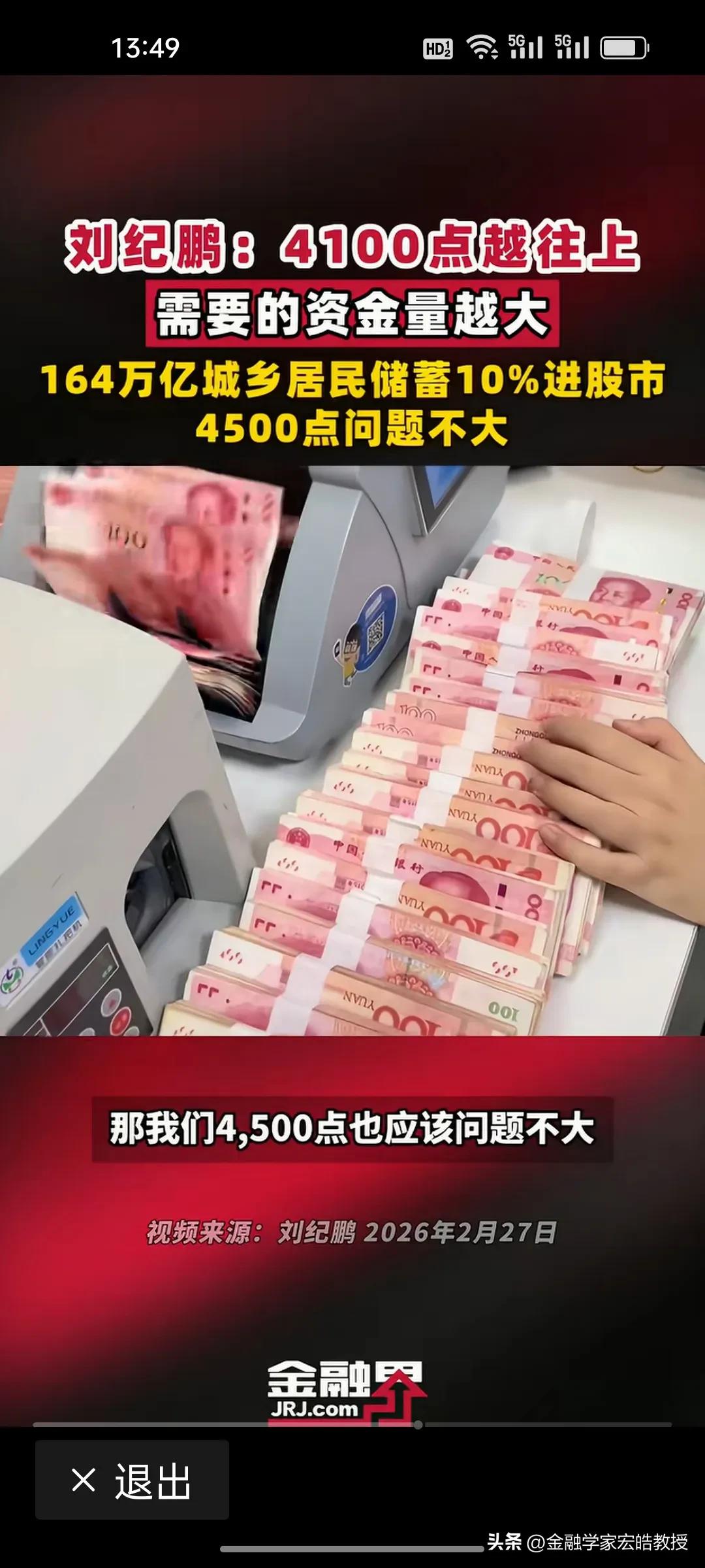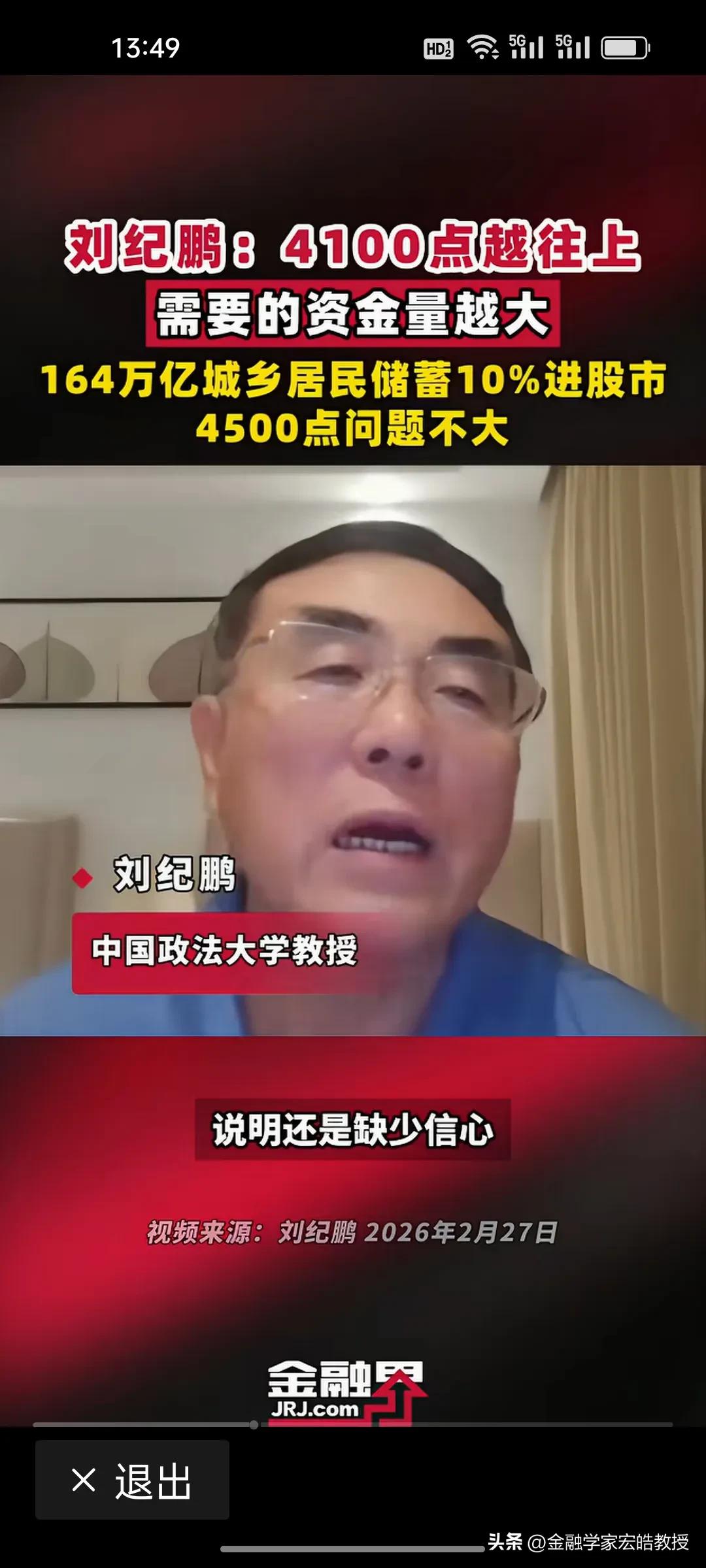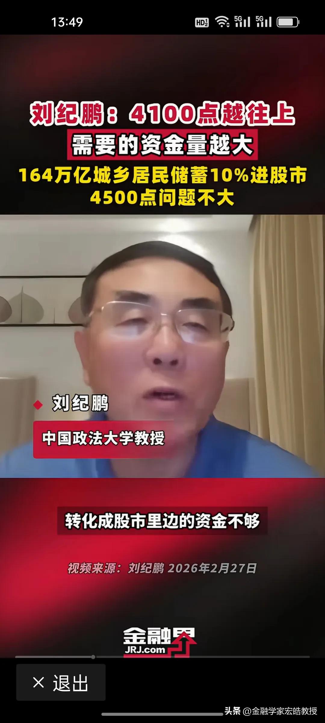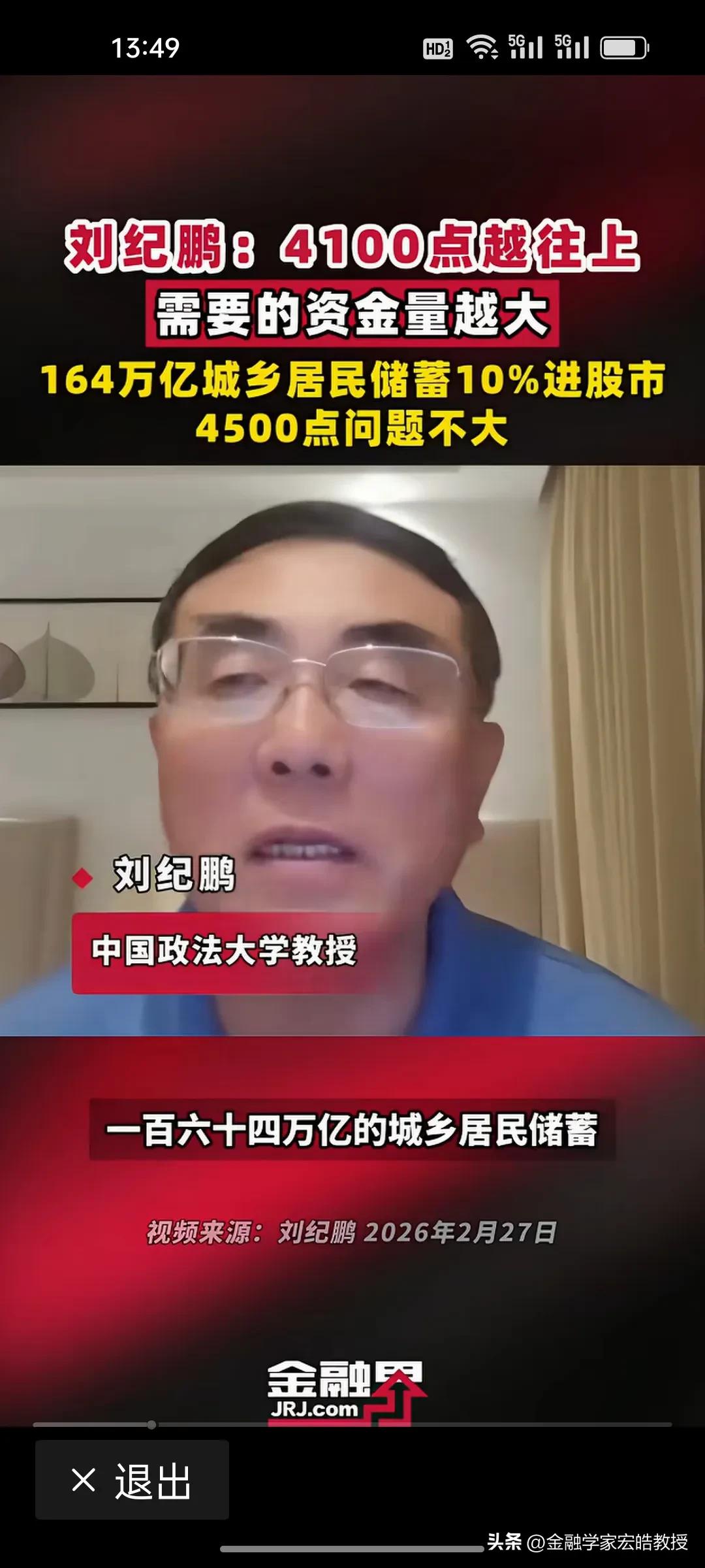 刚刚,刘继鹏教授最新视频解读了A股如何能冲4500点? 刘继鹏教授视频中的一句话戳中了A股的命门:4100点越往上,需要的资金量越大,而现在最大的问题就是——居民储蓄转化成股市资金的速度太慢了。 164万亿城乡居民储蓄,哪怕只拿出10%,就是16.4万亿活水。这笔钱要是真能进场,冲击4500点的问题就不大了。 但现实是,大家宁愿把钱存银行,也不敢往股市里投。刘继鹏教授认为还是市场信心不足,怕进去就成了接盘侠。 很多人看到近期韩日,英法股市都羡慕不已,想不通我们股市为什么最近横盘而不是一往无前往上攻?刘继鹏教授的一番话有一定的道理,什么时候能让老百姓相信“炒股能赚钱”,而不是“炒股被收割”,那才是A股真正起飞的时刻。天南地北大拜年