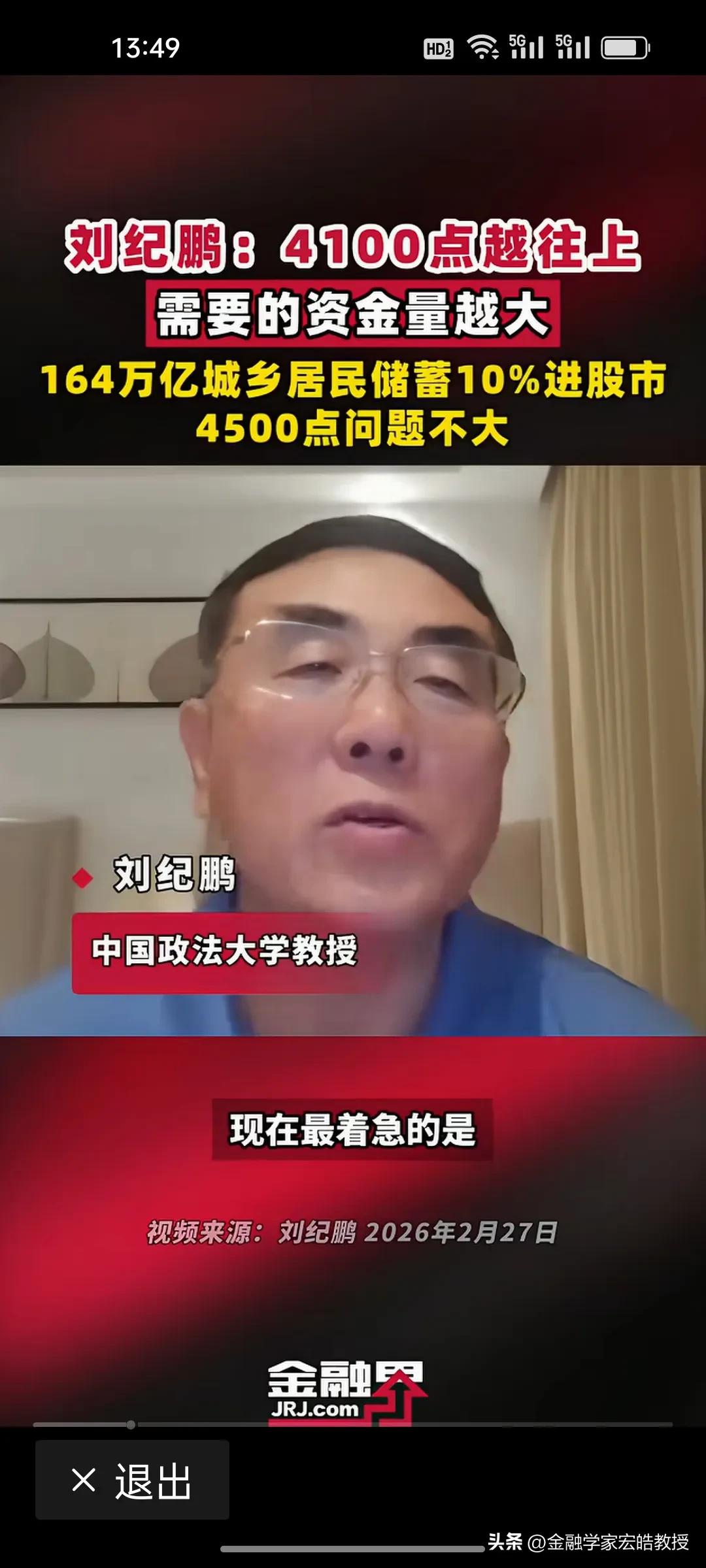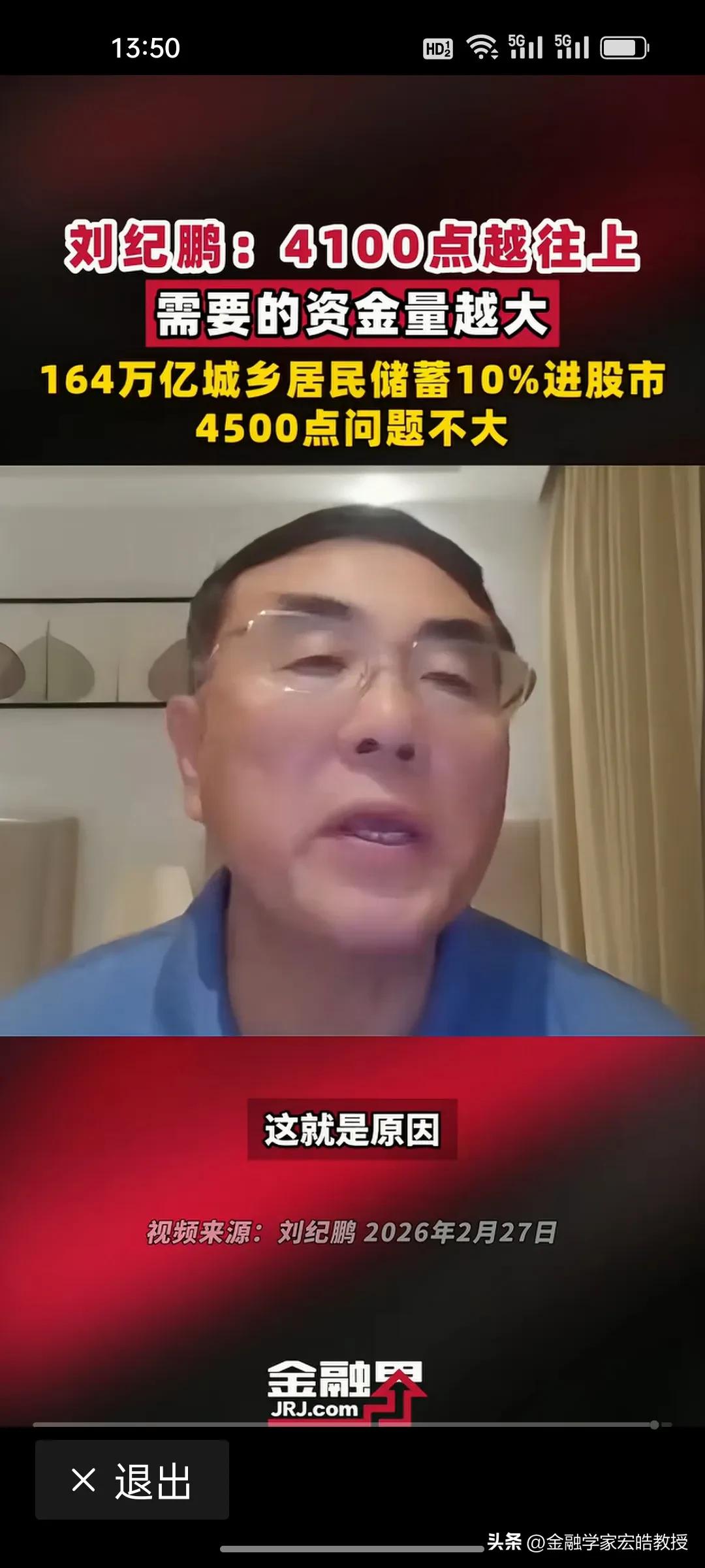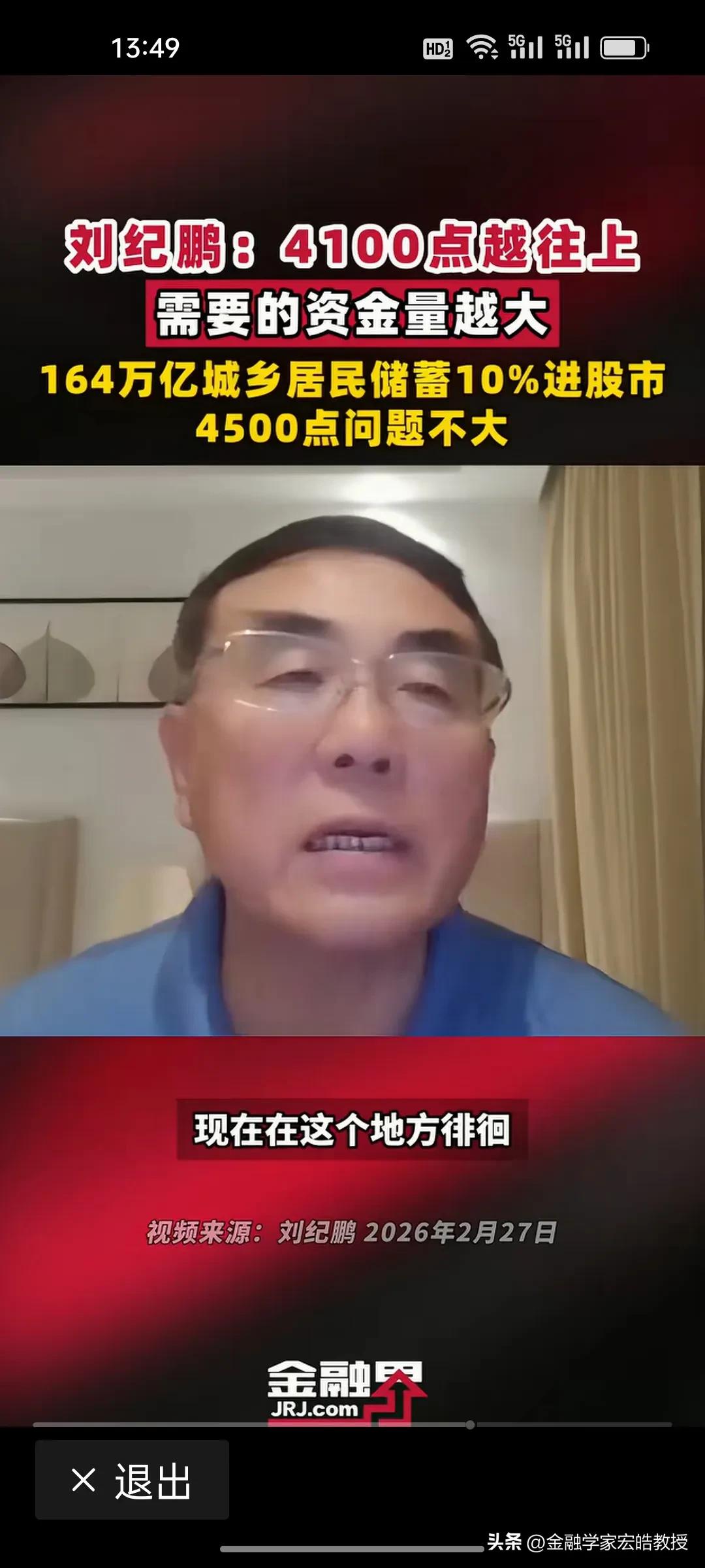 刚刚,刘继鹏教授最新视频解读了A股如何能冲4500点? 刘继鹏教授视频中的一句话戳中了A股的命门:4100点越往上,需要的资金量越大,而现在最大的问题就是——居民储蓄转化成股市资金的速度太慢了。 164万亿城乡居民储蓄,哪怕只拿出10%,就是16.4万亿活水。这笔钱要是真能进场,冲击4500点的问题就不大了。 但现实是,大家宁愿把钱存银行,也不敢往股市里投。刘继鹏教授认为还是市场信心不足,怕进去就成了接盘侠。 很多人看到近期韩日,英法股市都羡慕不已,想不通我们股市为什么最近横盘而不是一往无前往上攻?刘继鹏教授的一番话有一定的道理,什么时候能让老百姓相信“炒股能赚钱”,而不是“炒股被收割”,那才是A股真正起飞的时刻。天南地北大拜年