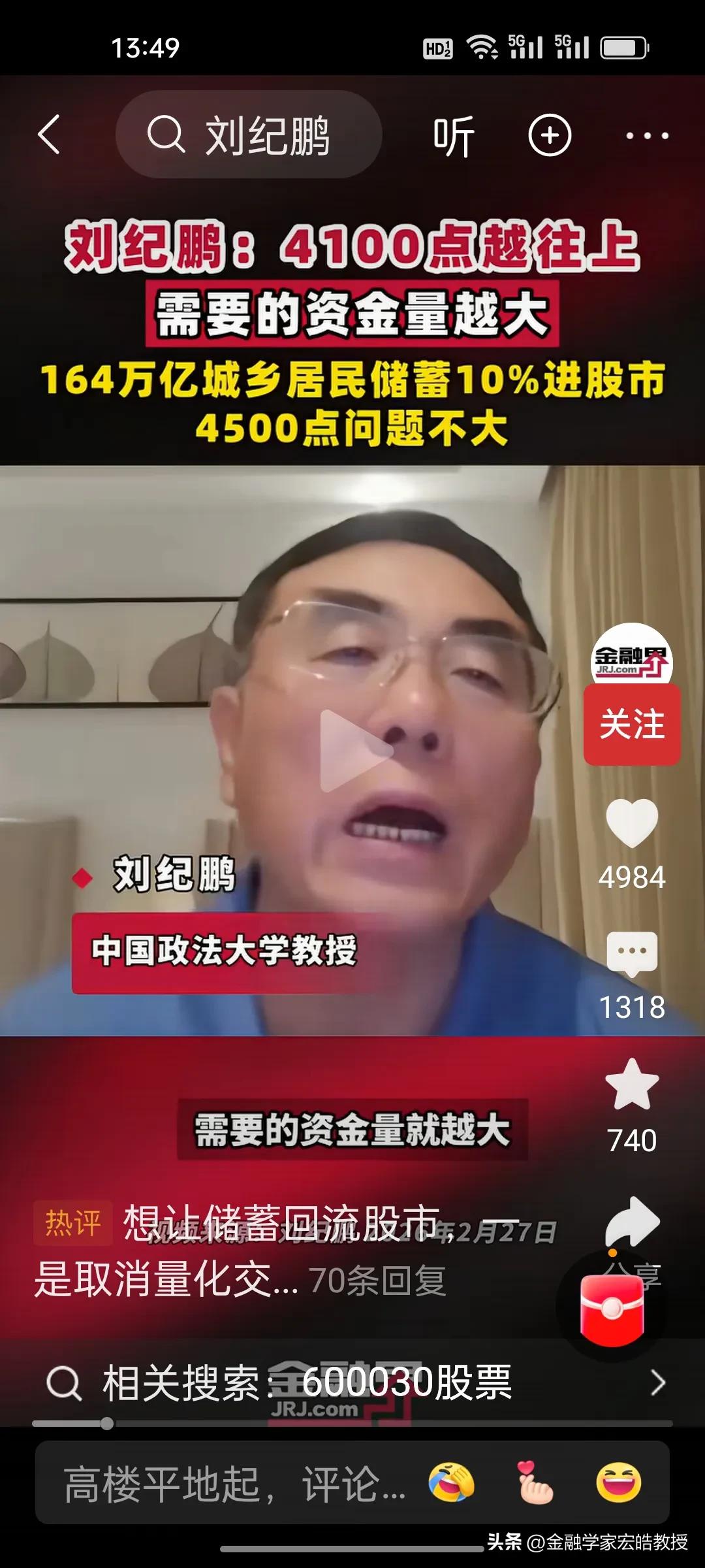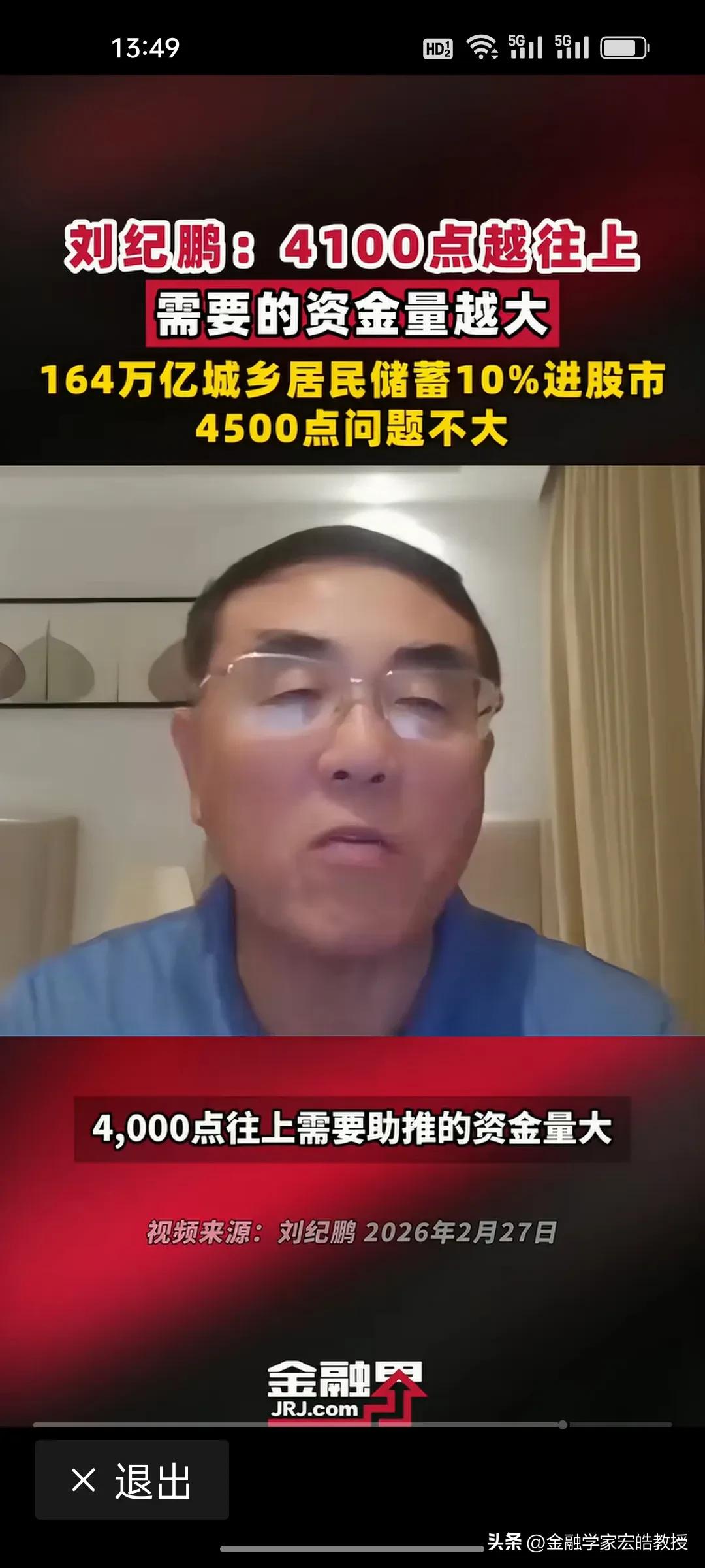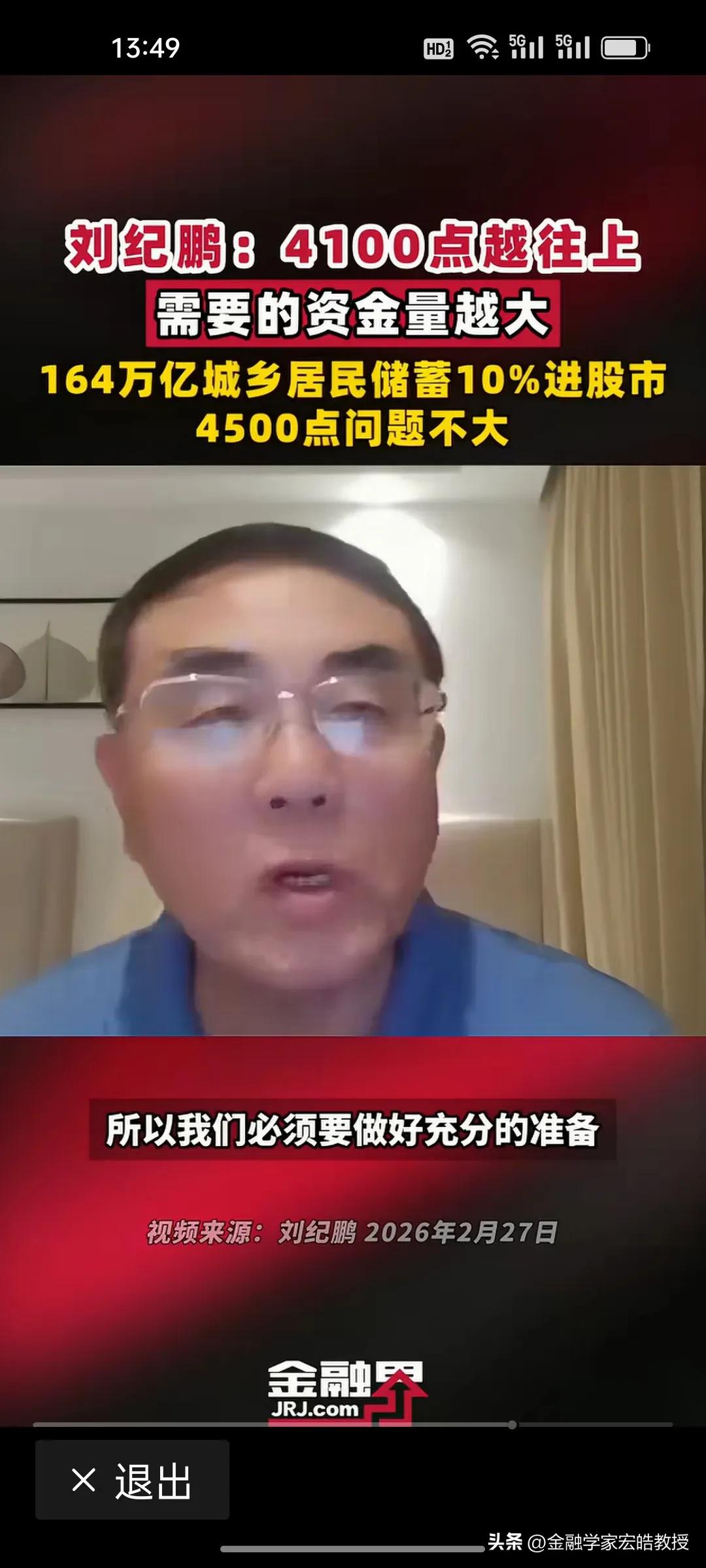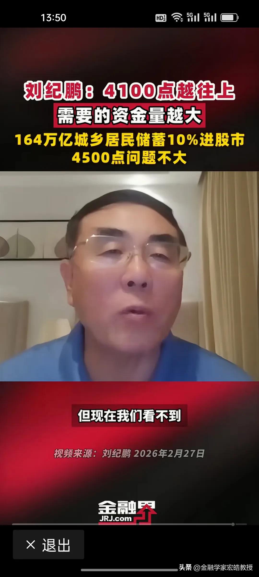 刚刚,刘继鹏教授最新视频解读了A股如何能冲4500点? 刘继鹏教授视频中的一句话戳中了A股的命门:4100点越往上,需要的资金量越大,而现在最大的问题就是——居民储蓄转化成股市资金的速度太慢了。 164万亿城乡居民储蓄,哪怕只拿出10%,就是16.4万亿活水。这笔钱要是真能进场,冲击4500点的问题就不大了。 但现实是,大家宁愿把钱存银行,也不敢往股市里投。刘继鹏教授认为还是市场信心不足,怕进去就成了接盘侠。 很多人看到近期韩日,英法股市都羡慕不已,想不通我们股市为什么最近横盘而不是一往无前往上攻?刘继鹏教授的一番话有一定的道理,什么时候能让老百姓相信“炒股能赚钱”,而不是“炒股被收割”,那才是A股真正起飞的时刻。天南地北大拜年