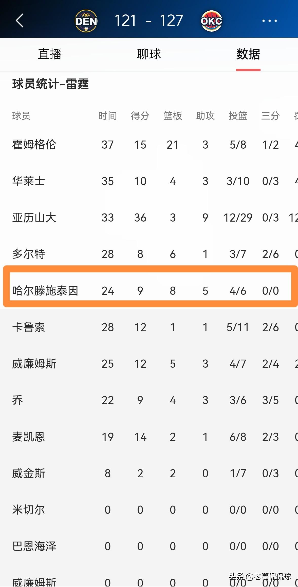 雷霆当家中锋哈腾真是太全能了!在今天雷霆主场以127:121险胜掘金的比赛中,哈腾将自己的全面性展现的淋漓尽致。 全场比赛下来,哈腾首发出战24分钟,投篮6中4,其中罚球2中1非常高效的得到9分,还有8篮板5助攻2抢断2盖帽。 坦白说,雷霆能够拥有哈腾这种全能中锋真是太幸运了,哈腾能够在攻防两端为球队提供非常大的帮助。