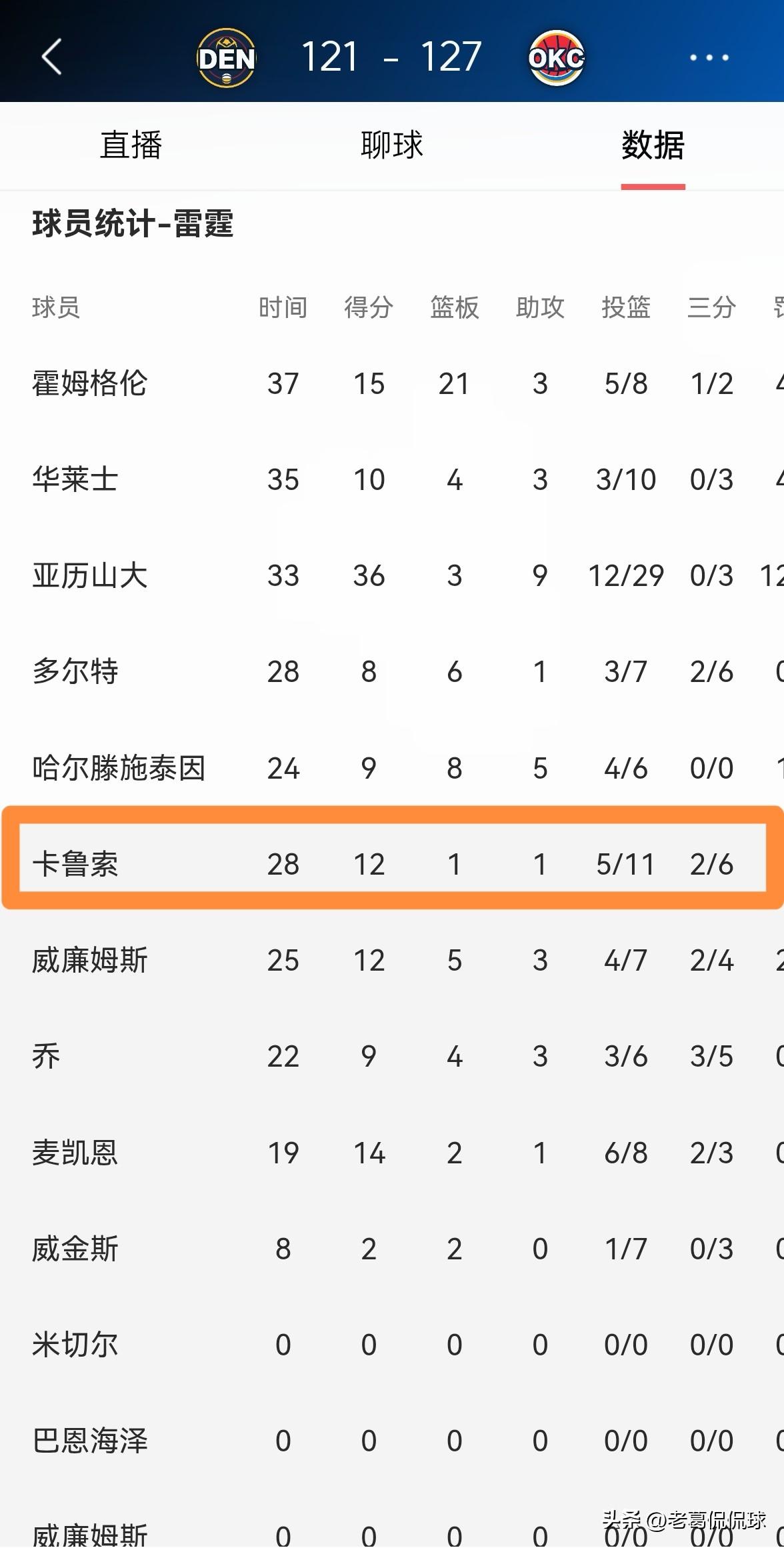 我忍不住要怒赞雷霆大将卡鲁索!在今天雷霆主场以127:121击败掘金的比赛中,卡鲁索在关键的第四节比赛和加时赛中发挥神勇,为球队的获胜立下了汗马功劳。 整场比赛下来,卡鲁索替补出战28分钟,投篮11中5,其中三分球6中2砍下12分,还有1篮板1助攻2抢断。 实事求是的说,卡鲁索天生就是一个大场面球员,比赛越是到了关键时刻,卡鲁索越是表现出色,今天这场比赛就是最好的证明。