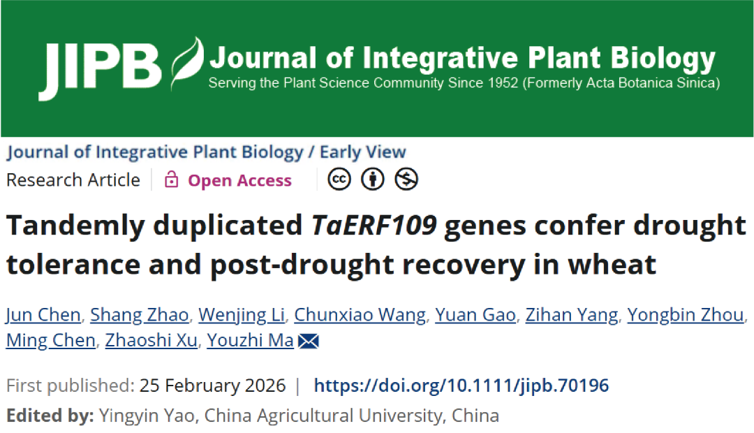 Chen,J.,Zhao,S.,Li,W.,Wang,C.,Gao,Y.,Yang,Z.,Zhou,Y.,Chen,M.,Xu,Z.,Ma,Y.(2026).TandemlyduplicatedTaERF109genesconferdroughttoleranceandpost-droughtrecoveryinwheat.J.Integr.PlantBiol.https://doi.org/10.1111/jipb.70196