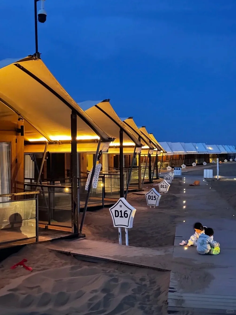 B区木屋散落在沙丘上,独栋设计,推门就是沙子。每间木屋门口都配有滑沙板,孩子能玩一整天不带进屋的。