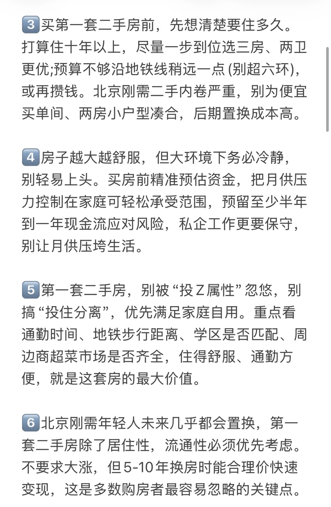 3️⃣买第一套二手房前,先想清楚要住多久。打算住十年以上,尽量一步到位选三房、两卫更优;预算不够沿地铁线稍远一点(别超六环),或再攒钱。北京刚需二手内卷严重,别为便宜买单间、两房小户型凑合,后期置换成本高。