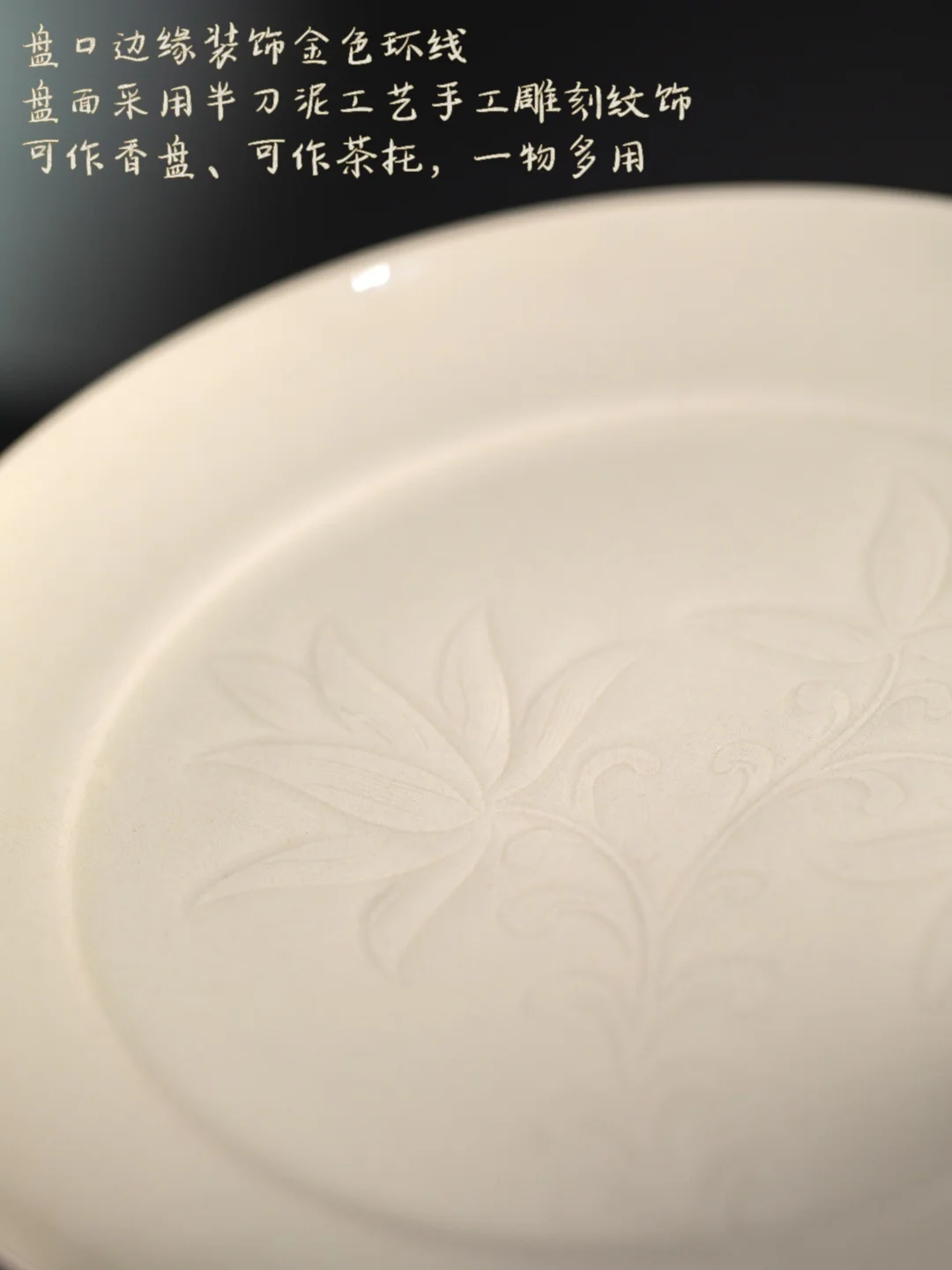 米浆黄的釉色温润,盘口描着一道细细的金线。半刀泥刻出的纹饰在光下深浅错落。它可以承香灰,可以托茶盏,也可以随手放几枚果子。一器多用,却不显丝毫敷衍。