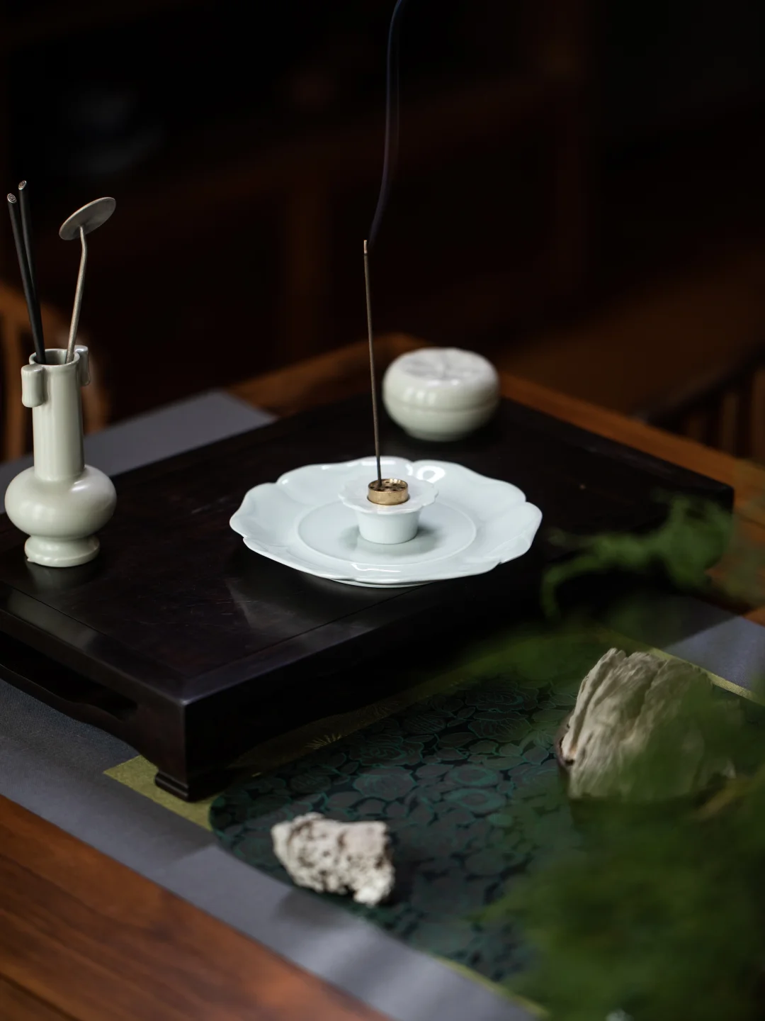四器各安其位,又彼此唱和。当茶汤入盏,香烟升起,这一案的清欢,便圆满了。