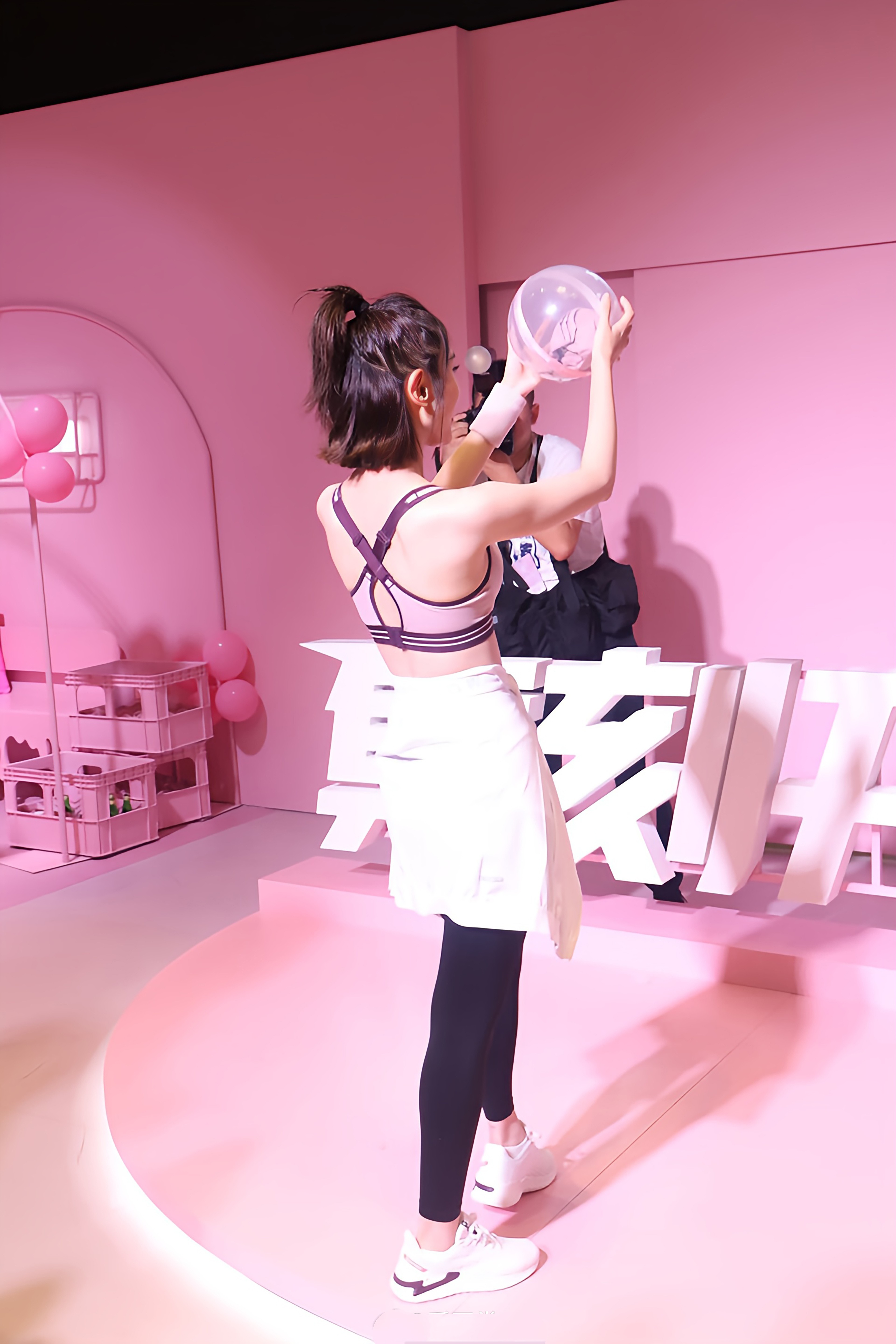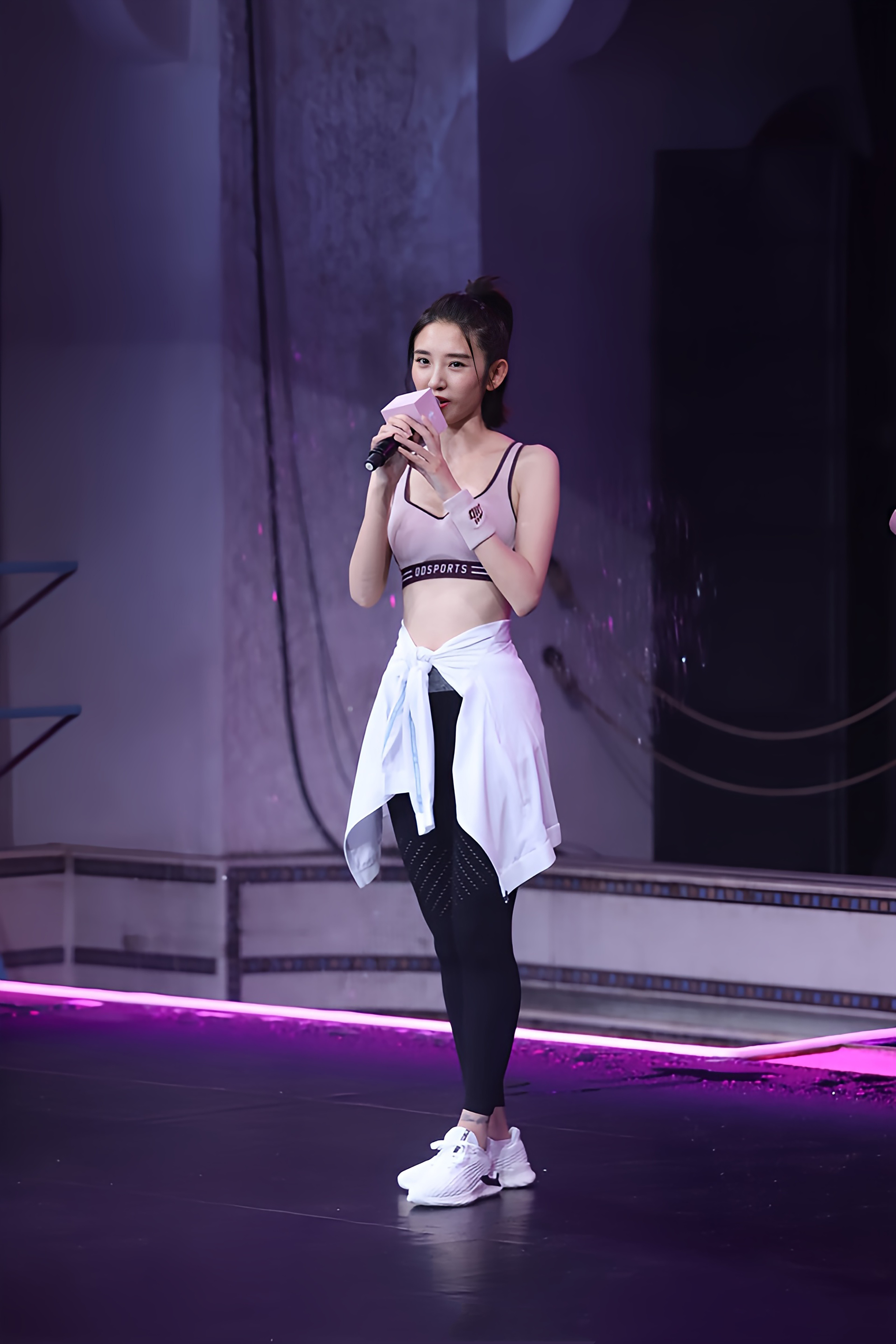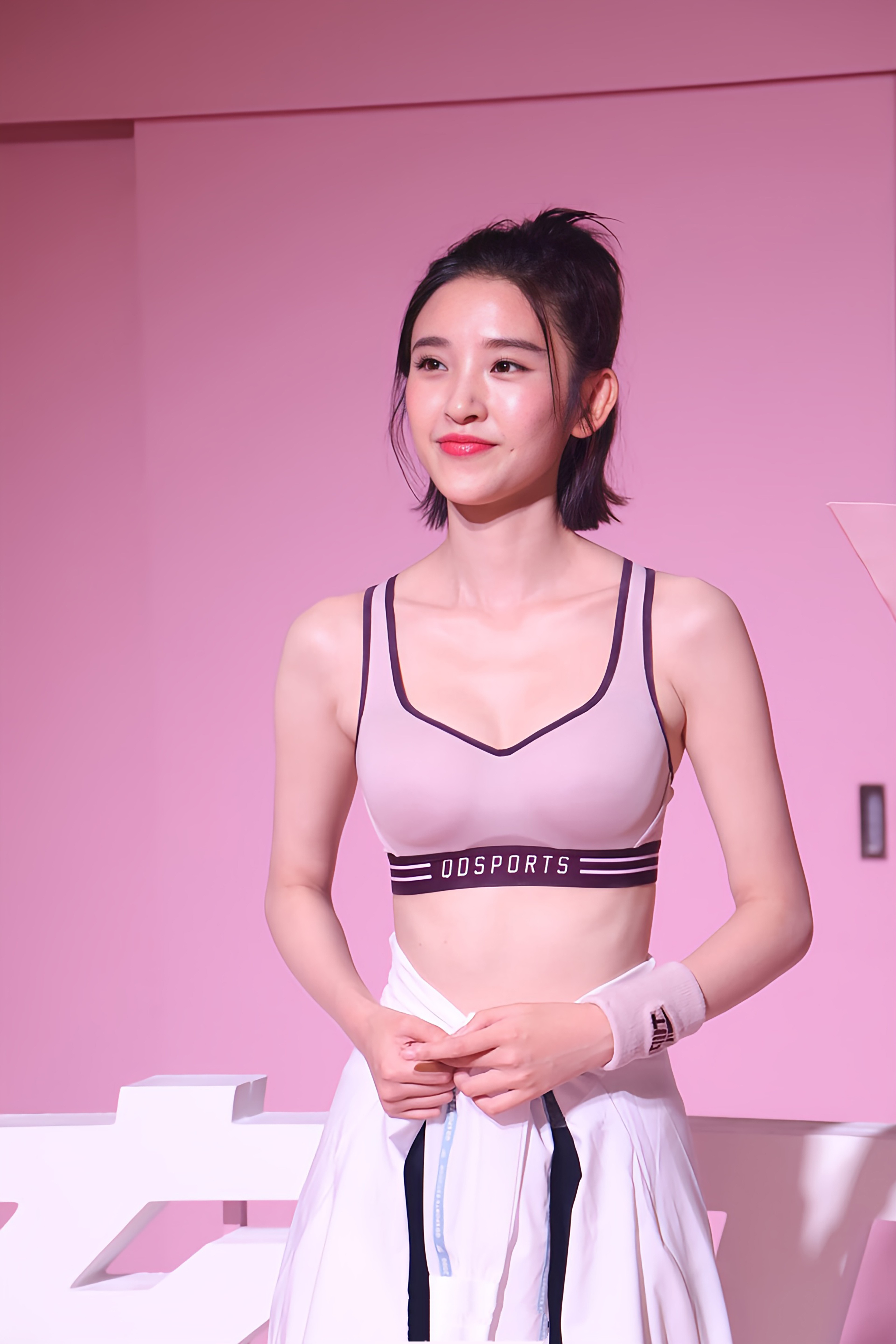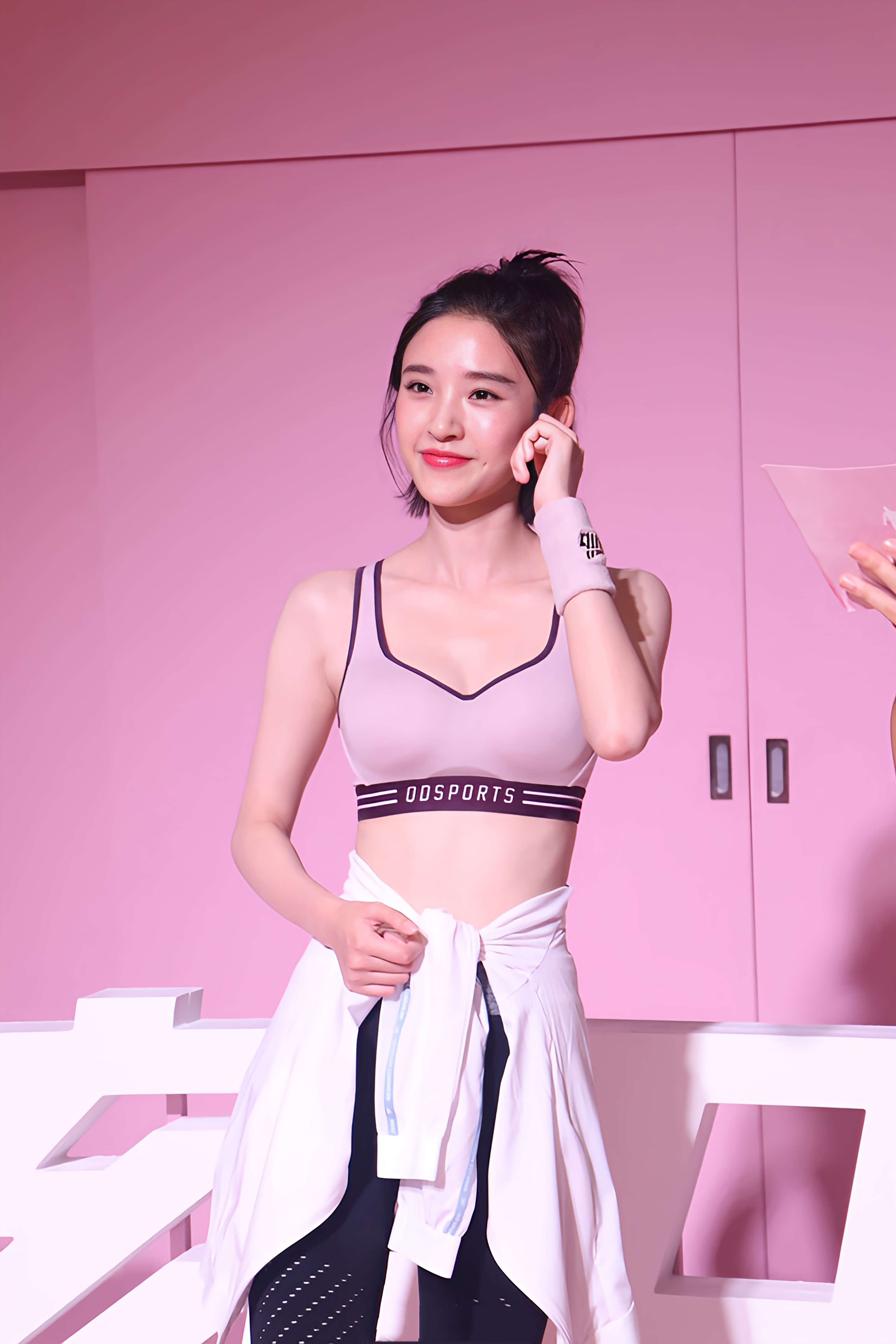 唐艺昕瑜伽服穿搭,粉色吊带黑色紧身裤,尽显优越好身材。唐艺昕