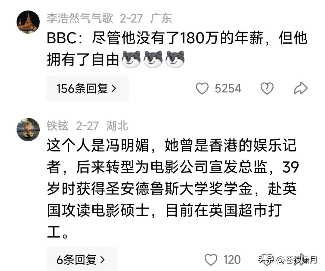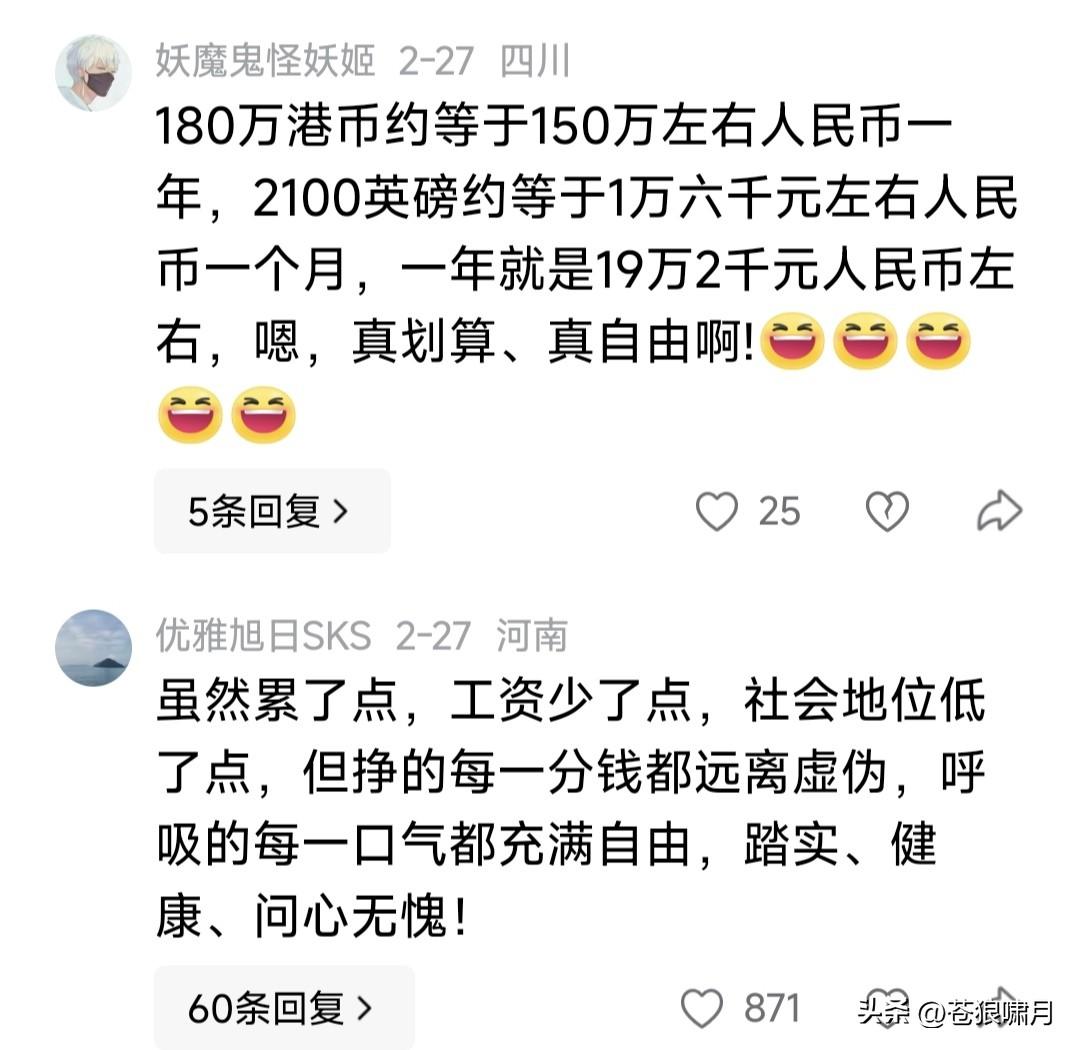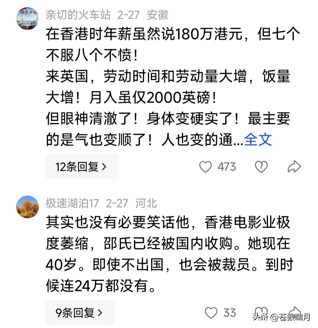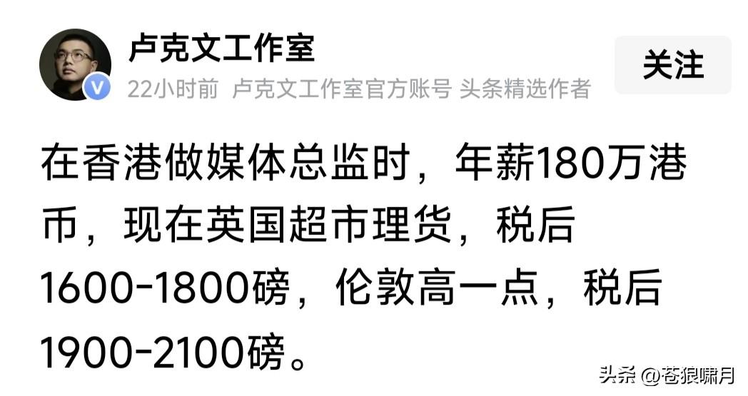 卢克文发博:她做香港媒体总监时,年薪180万港币!现在伦敦超市理货,税后1600~1800英镑,伦敦稍高一点,大概税后1800~2100英镑。 本人没看懂,小卢此文啥意思?是像牢A那样,控诉英国“斩杀线”?还是说此女为圆留学梦,竟由香港年薪180万,跌到英国超市理货2000英镑,是从“天堂”跳进“地狱”里了吗? 苍狼阅读网友留言,有几点疑问: 1.港元180万是年薪,约人民币150万。英镑2000是月薪,合人民币1.6万,一年大概20万。我们在国内,几个人能挣到这个数?恐怕不多吧? 2.此女在香港担任影宣总监,年薪180万港元,应是港影鼎盛时期。现在港影什么状况?网友说已极度萎缩,“邵氏”还被国内收购。如果还能拿180万,她会去伦敦超市做理货工作吗? 3.她当影选总监时,应是年轻之时。39岁赴英留学,应是港影衰落之后,薪酬大幅缩水或入不敷出,不得已才去英国留学吧?现在40岁,留学第二年,学校有奖学金,业余打工是外快,两项收入加一起,是否应该几十万? 4.香港曾是英国殖民地,回归中国后,她是否不习惯?选择去英国留学,是否将来要留在英国工作?目前各国互通有无,无论她如何选择,我们都应给予理解。至于快乐与否?天知道! …………