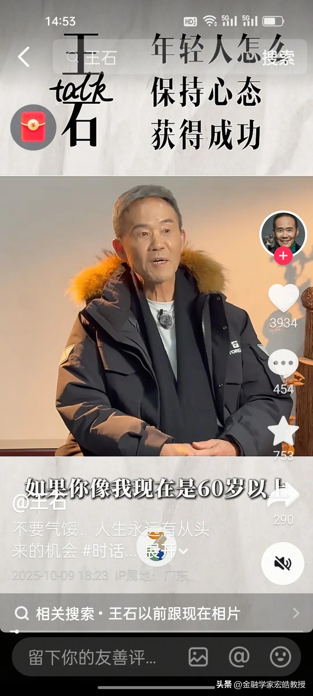 看下图,王石现身香港,寸头新造型亮相!74岁仍奋战在一线。 最近,王石在香港与企业家聚会的照片刷屏,他摘掉了节目里的假发,以利落寸头亮相,不少网友猜测是刚完成植发。 今年已经74岁的王石,气色依旧红润,完全没有“安享晚年”的意思。他一边活跃在商业和公益一线,一边在短视频里分享碳中和、职场经验,甚至还在节目里聊起“60岁后人生重来”的话题。 从万科掌舵人到如今的公益先锋,他始终在突破自己的边界。对他来说,年龄从来不是限制,而是新的起点。天南地北大拜年