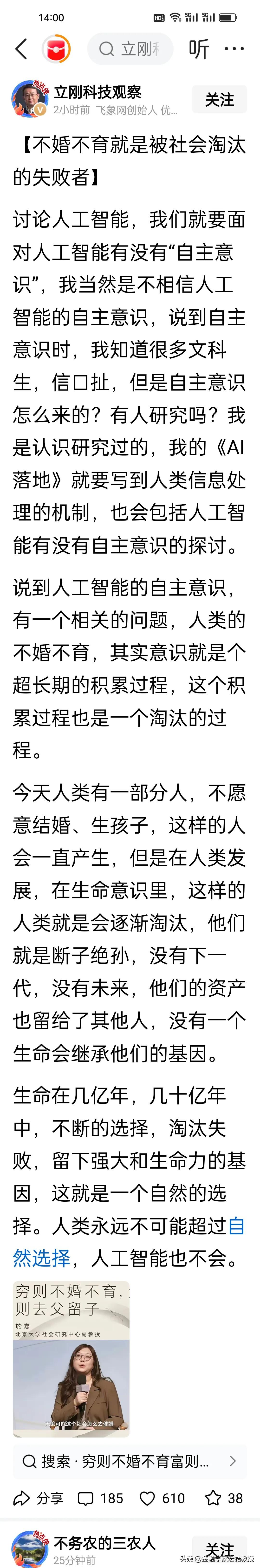 刚刚看到,项立刚发文称“不婚不育是失败者”,这波言论很多网友表示不认同。 项立刚的言论直接引爆舆论,核心观点有两个: 1.不婚不育是淘汰:将人类繁衍与自然选择绑定,称不婚不育者是“断子绝孙”,会被生命意识逐渐淘汰,基因无法传承。 2. 人类无法超越自然:生命几十亿年的淘汰法则不可违背,AI也无法超越自然选择的规律。 但他完全忽略了当代年轻人的现实困境:结婚成本高,房价高、职场内卷、育儿成本压得人喘不过气,不婚不育更多是无奈选择,而非“失败”。用几十年前的眼光评判当下,只会显得格格不入。天南地北大拜年