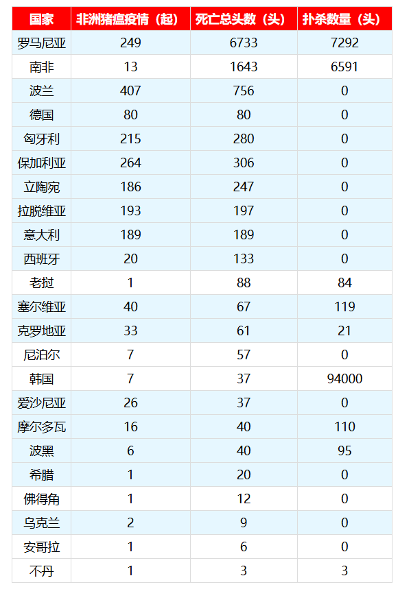 从死亡和扑杀数量来看,情况则呈现出另一种分布。虽然欧洲疫情起数多,但由于以野猪为主,单起疫情造成的死亡数量并不高,波兰400多起疫情仅死亡700多头野猪,保加利亚、意大利等国的死亡数甚至与疫情起数持平。真正引发大规模生猪损失的,是家猪疫情。今年1月至2月,罗马尼亚、南非和韩国的家猪疫情引发了较为集中的感染和扑杀。特别是罗马尼亚,仅在2月3日至6日的一次通报中,就有6341头家猪感染,最终导致大批生猪死亡和被扑杀。韩国的情况也很典型,虽然仅报告了7起家猪疫情,但为了彻底拔除疫源,扑杀数量高达9.4万头,是今年前两个月全球扑杀量最多的国家。