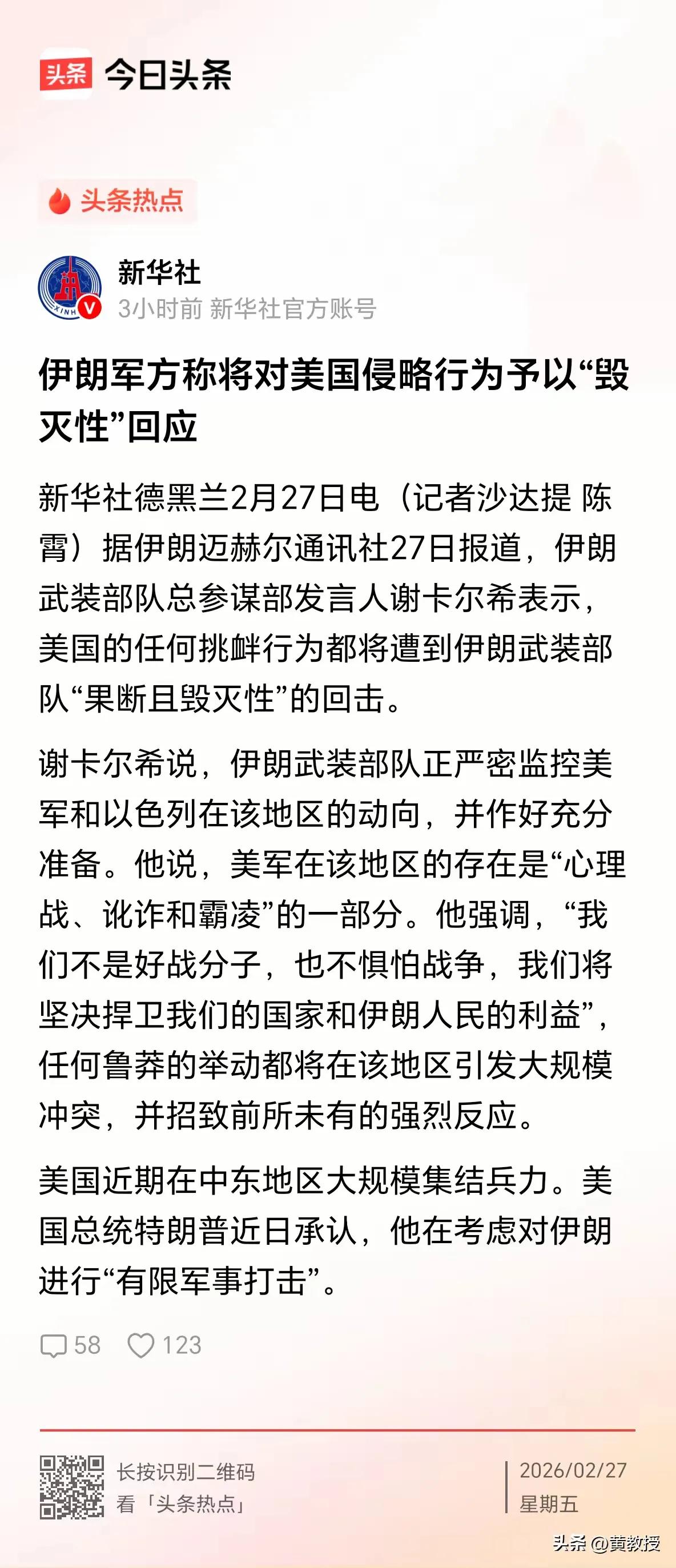 伊朗声称为毁灭性报复做准备。准备到啥时候? 28日,美以突然发起对伊朗的军事行动,使用导弹击中德黑兰的总统府和伊朗最高领袖哈梅内伊官邸附近区域。甚至说,美导弹直接打到哈梅内伊办公室上空,侮辱性极强。 此前,伊朗高调宣布,一旦美国发起侵略行为,将对美国予以毁灭性打击(图二)! 今天的报道(图一)又说,伊朗正在为“毁灭性”报复做准备。这给我的印象又是说最狠的话,挨最狠的揍。人家都打到哈梅内伊办公室门上来了,你却还在准备?干嘛去了?