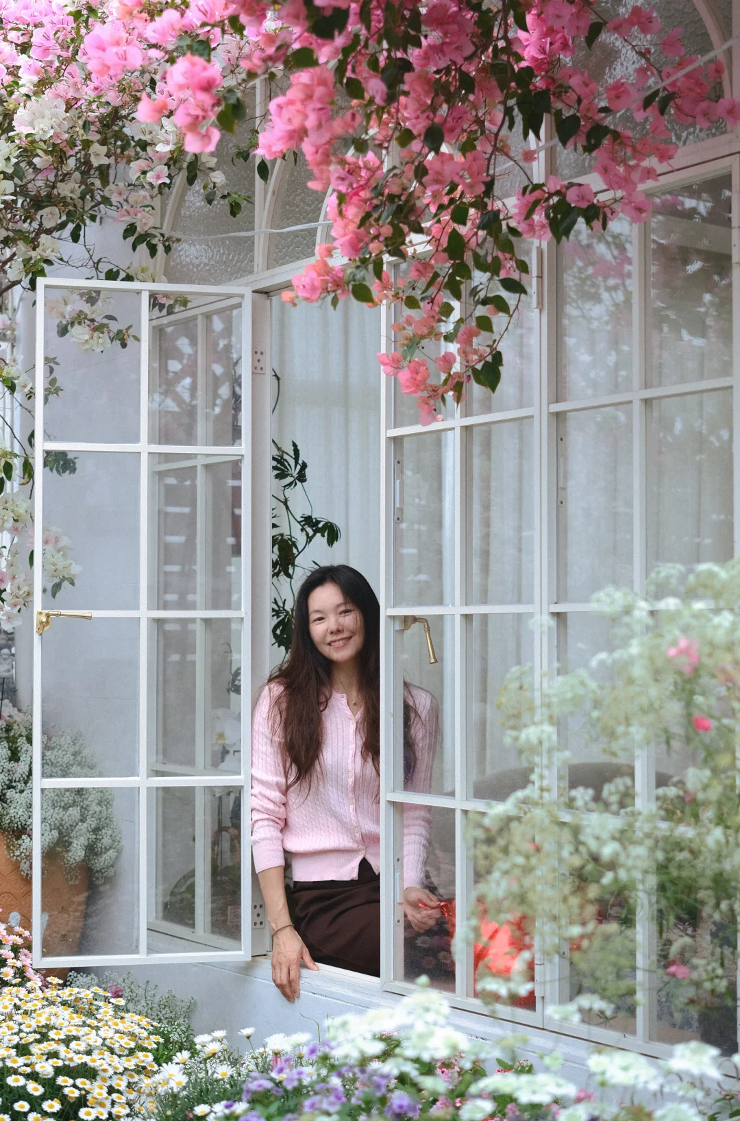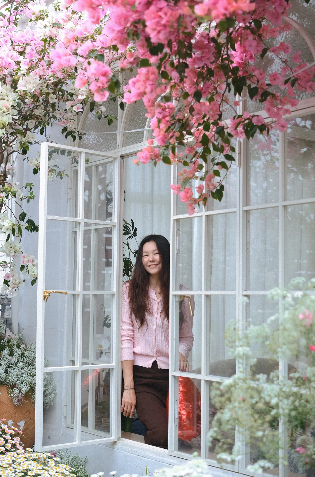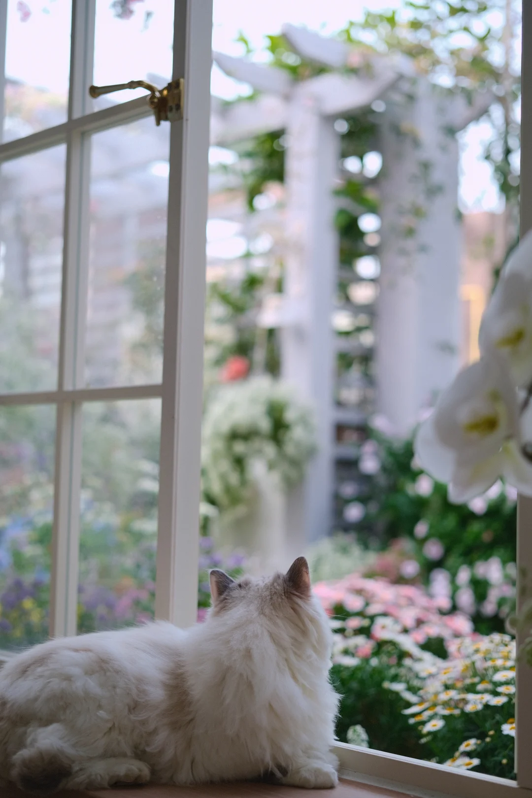 午后窝在窗边,听猫咪在花丛旁打呼。