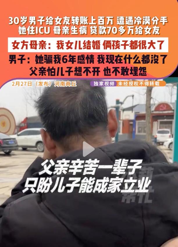 太坏了!河南商丘,一痴情男子给女友转账100多万,谈了6年才发现,对方不仅结了婚,还是两个孩子的妈,孩子都很大了,这惊天一闷棍,让男子的父亲声泪俱下。网友直呼:这不仅是骗钱,这是要人命啊。 在2月27号,这件事被媒体曝光出来,这位男子姓曹,他在工厂认识了这个女孩,俩人谈了6年,起初女孩说亲妈生病,他二话不说贷款10万打过去。第3年俩人在微信上订了婚,他又交了36000元礼金。到了第4年,女孩说眼睛要做手术,开口就要20多万。紧接着对方哥哥又说女子进了icu,命悬一线,曹先生心急如焚,又凑了20万转过去。甚至对方说家里欠了高利贷,他也咬牙贷款18万给填了坑。 曹先生这6年基本是倾其所有,自己打工挣的钱花光了,还背了70多万的贷款。可等到他想见面的时候,对方父母却死活不同意,女孩直接闹分手。曹先生满脑子疑问找到对方家里,结果真相像雷一样劈下来,人家不仅结婚了,连孩子都很大了,这6年他省吃俭用供养的,竟然是一个已婚妇女的家庭。 曹先生的父亲在一旁哭得稀里哗啦,老人家白天黑夜在外面干活,原本指望儿子成家立业,现在天都塌了。看着儿子眼神空洞、一脸虚脱的样子,老父亲连一句重话都不敢说,就怕孩子钻牛角尖想不开。 这件事起了不少人的愤怒,有网友现身说法:这是妥妥的刑事诈骗,赶紧报警,一定要利用法律武器把钱追回来。 甚至有网友分享说:哪怕拿不回全部,起码也要让骗子坐牢,不能让这家人白白欺负老实人。 不得不说,看完这男子的遭遇,真是又心疼又生气。这已经不是普通的恋爱脑了,这是被对方精准拿捏了责任心。对方利用生病、手术、icu这些极端的借口,进行长达6年的深度情感勒索。其实往简单了说,这种行为已经完全触犯了法律。 根据咱们国家的法律规定,隐瞒已婚事实,编造亲属生病、进icu这种虚假事实,骗取数额巨大的财物,这百分之百构成了诈骗罪。 现在最紧要是立即报警,虽然很多钱可能已经被对方挥霍了,但只要立了案,就能通过警方追查资金流向。如果对方真没钱还,法院也会强制执行,哪怕是查封房产或车辆,也能尽量减少损失。 只能这样才是给老父亲和自己这6年青春唯一的交代。 对此,你是怎么看的?