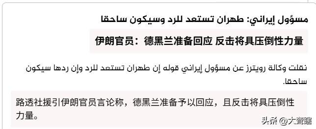 伊朗誓言对以色列发起‘’毁灭性‘’打击! 据外媒消息,自以色列发起对伊朗的军事打击后,伊朗官员表示伊朗军队即将作出反反击,将以压倒性的力量对以色列进行毁灭性反击。