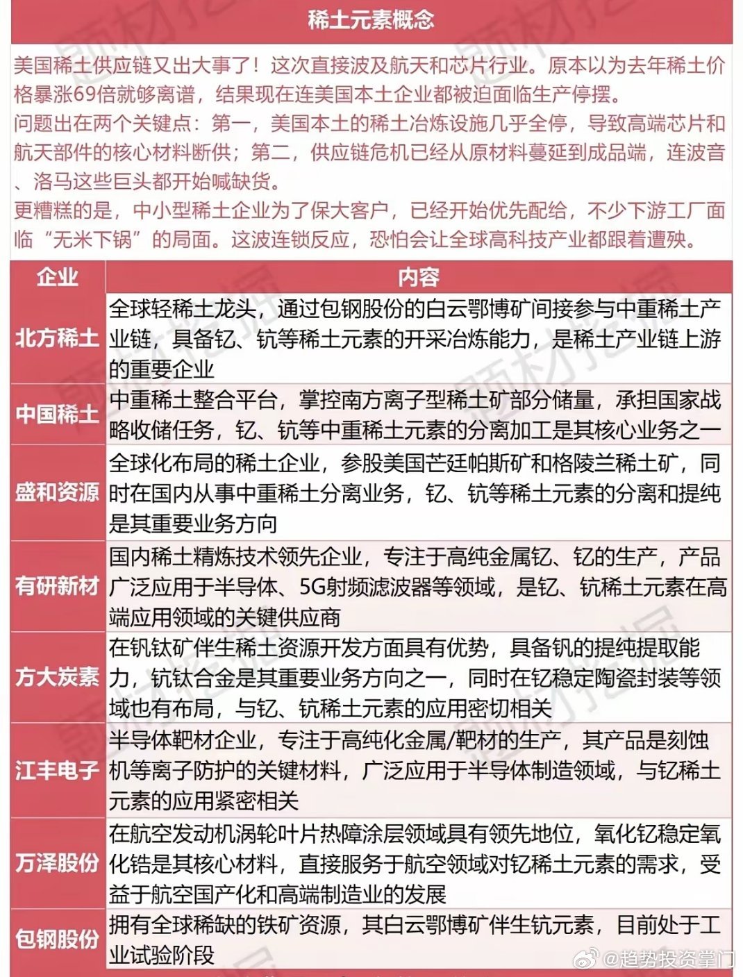 钇、钪告急!稀土+高端材料海外航天、半导体供应链遭遇钇、钪严重短缺,两大战略小金属全线紧缺,国内核心龙头:- 中国稀土(000831):中重稀土核心,钇/钪主力供应- 中稀有色(600259):钇钪分离龙头,高纯产能领先- 北方稀土(600111):氧化钇产能国内第一- 盛和资源(600392):高纯钪、钇金属核心供应商- 厦门钨业(600549):量产高纯氧化钪,半导体级供应- 有研新材(600206):高纯稀土金属,半导体/5G用钇钪- 东方锆业(002167):氧化钇、高纯钪提取- 龙佰集团(002601):钪业全产业链,铝钪合金风险提示:仅供参考,不构成投资建议,股市有风险,投资需谨慎。