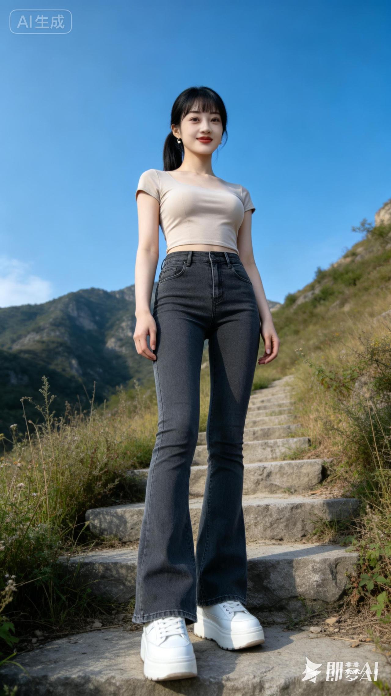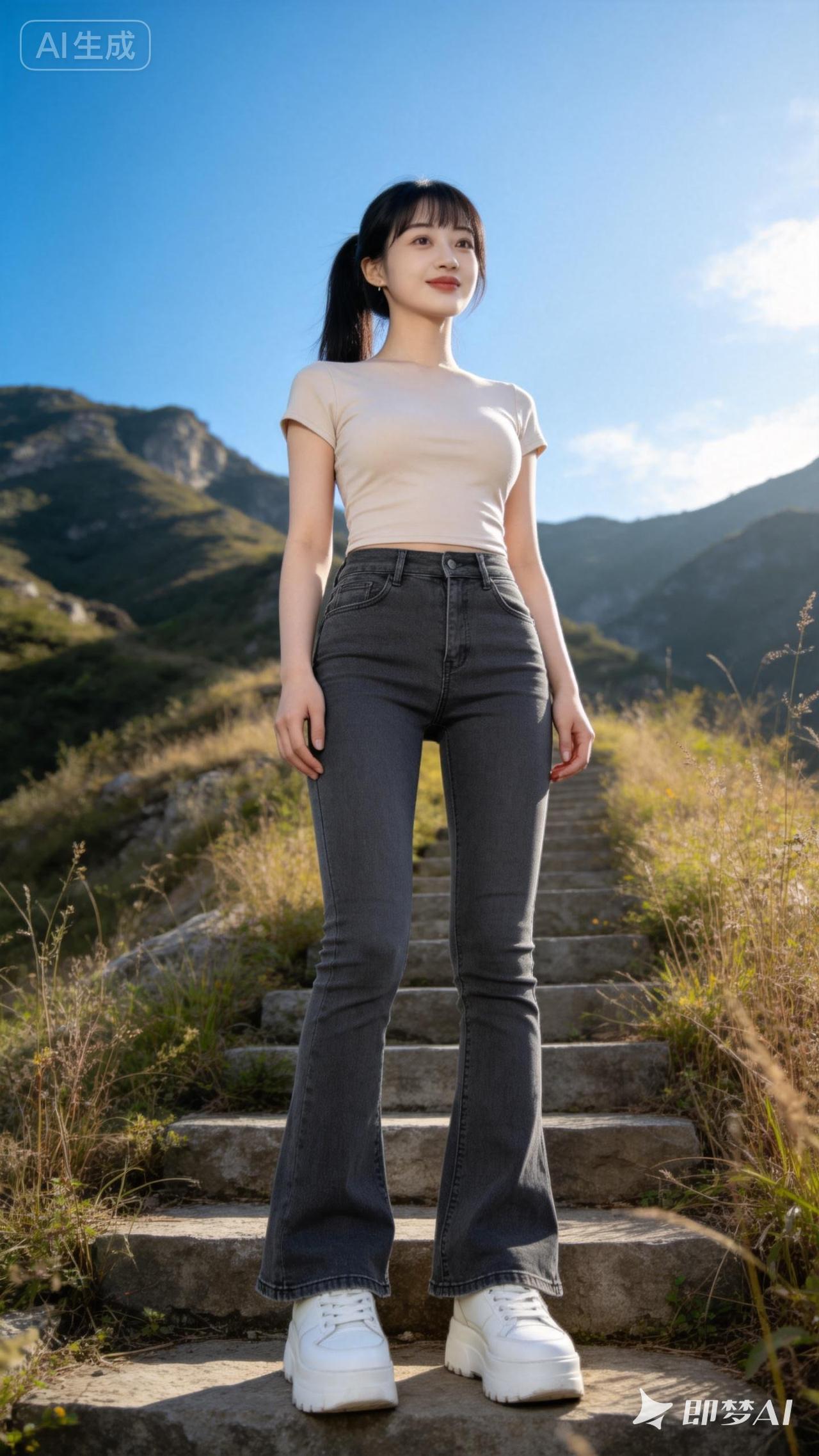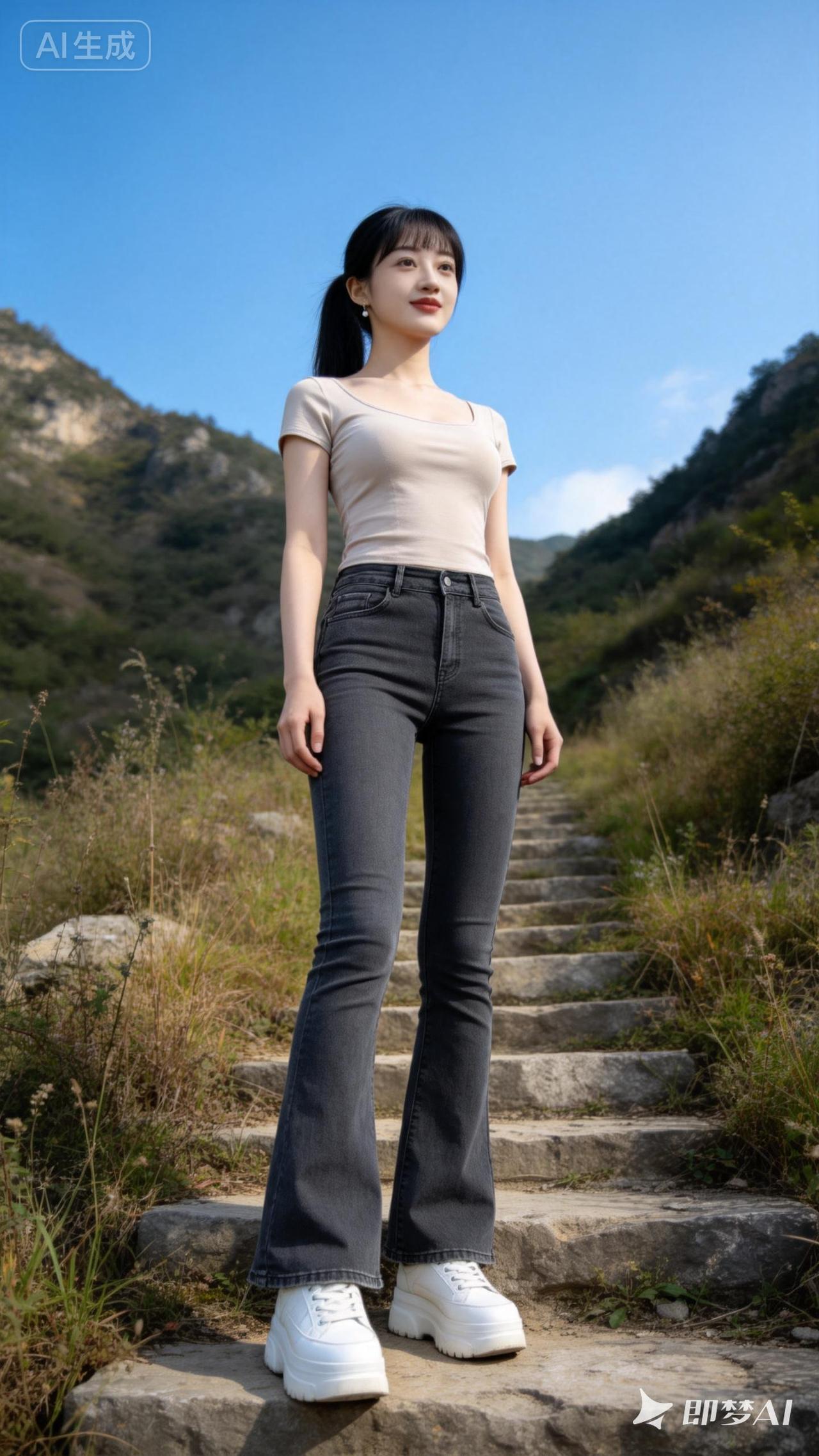 山间小径上的时尚少女,轻松自在,享受自然之美。