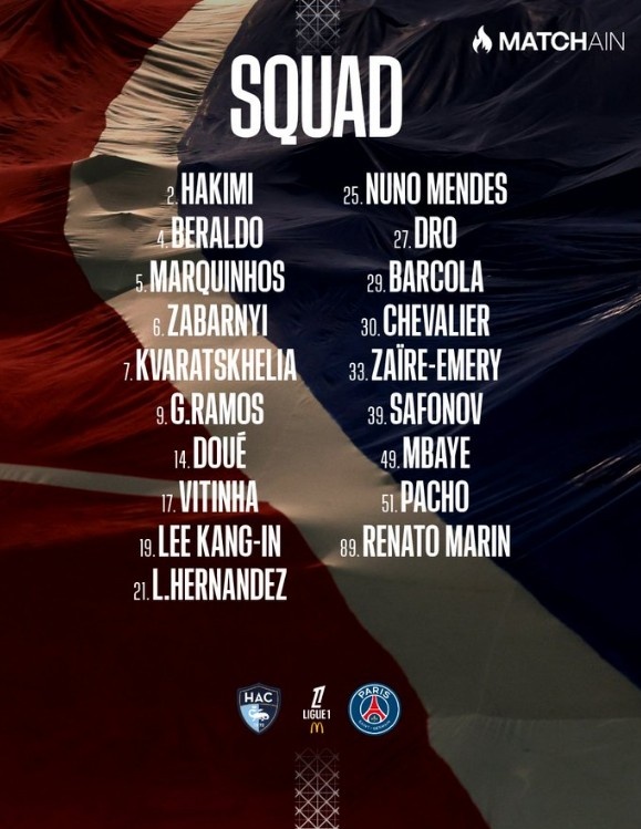 直播吧2月28日讯巴黎将在本轮法甲对阵勒阿弗尔,球队官方也公布了本场比赛大名单,具体如下: