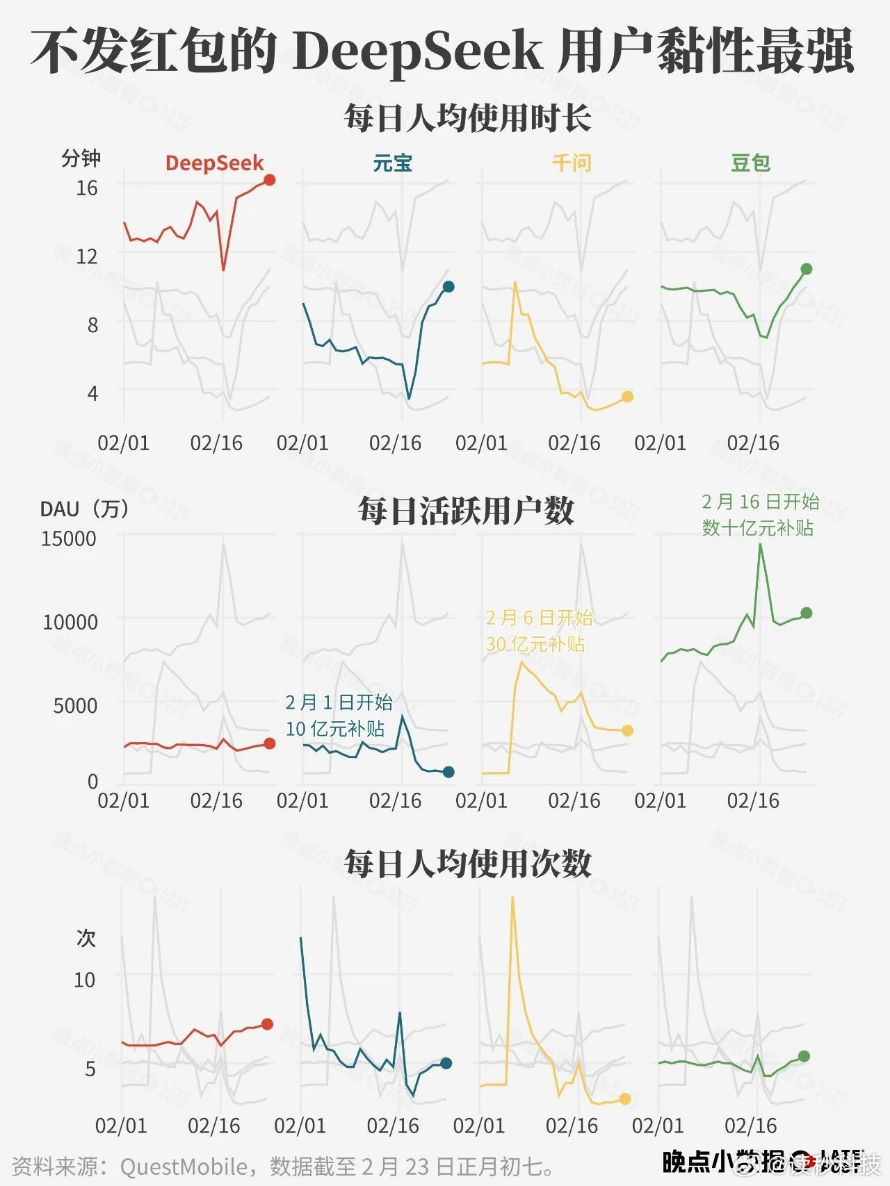 钱花得快,效果也来得快:根据QuestMobile数据,补贴最猛的时候,每天有1.4亿人打开字节豆包,7300万人打开阿里千问,4000万人打开腾讯元宝。连元宝的用户量也比没发红包的DeepSeek高出近一倍。deepseek不发红包用户黏性最强