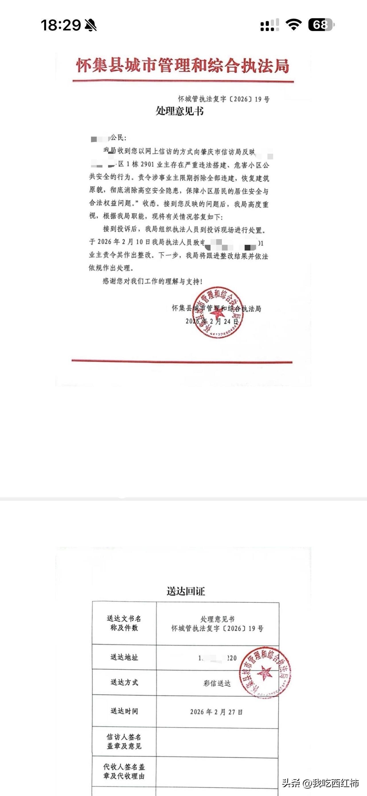 多管闲事?后续 2月27日城管部门回复处理意见书,表示再次致电楼下业主,责令整改。不清楚2月10日说请住建局认定违建的进度如何,后面我也会单独致电住建局。