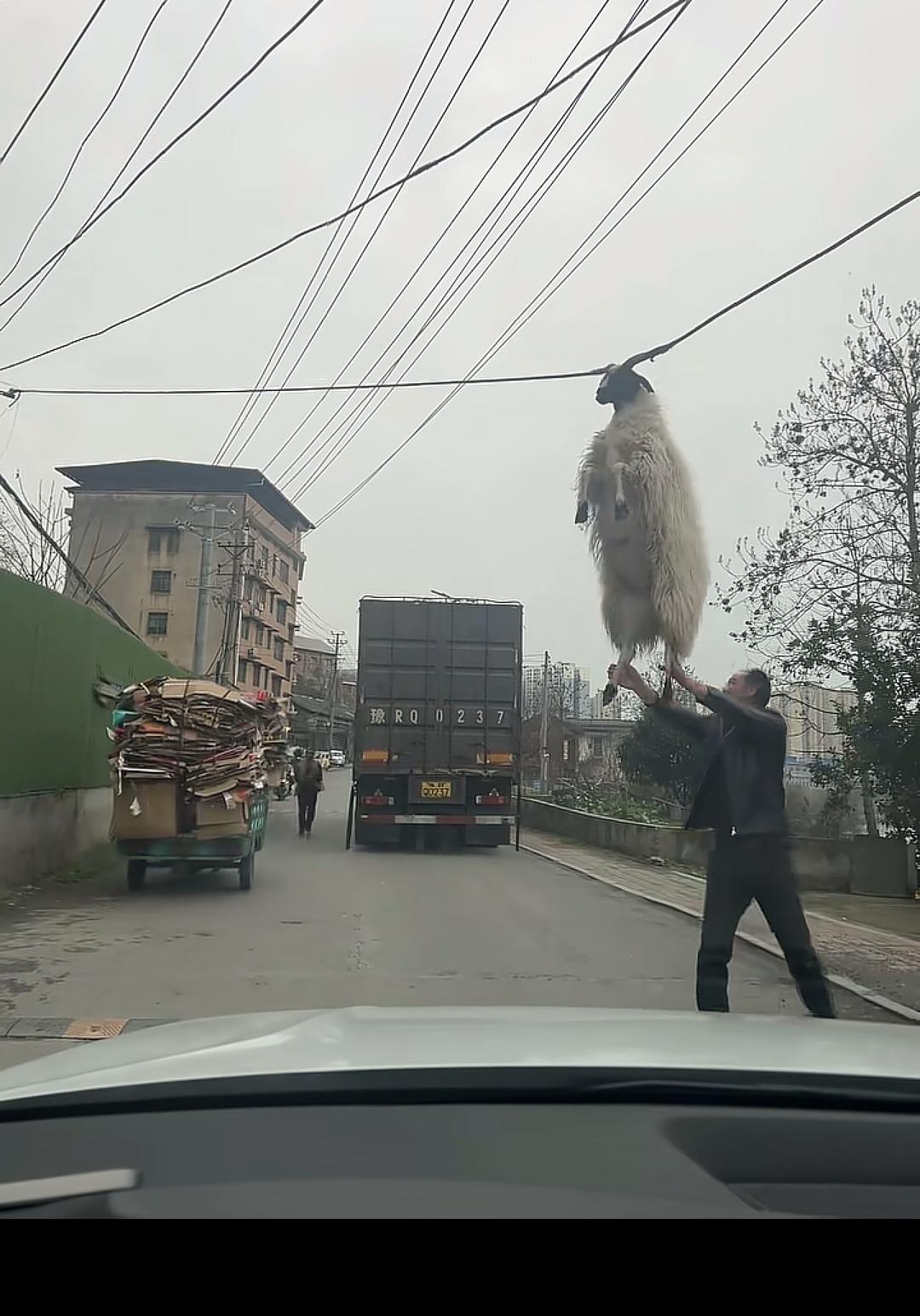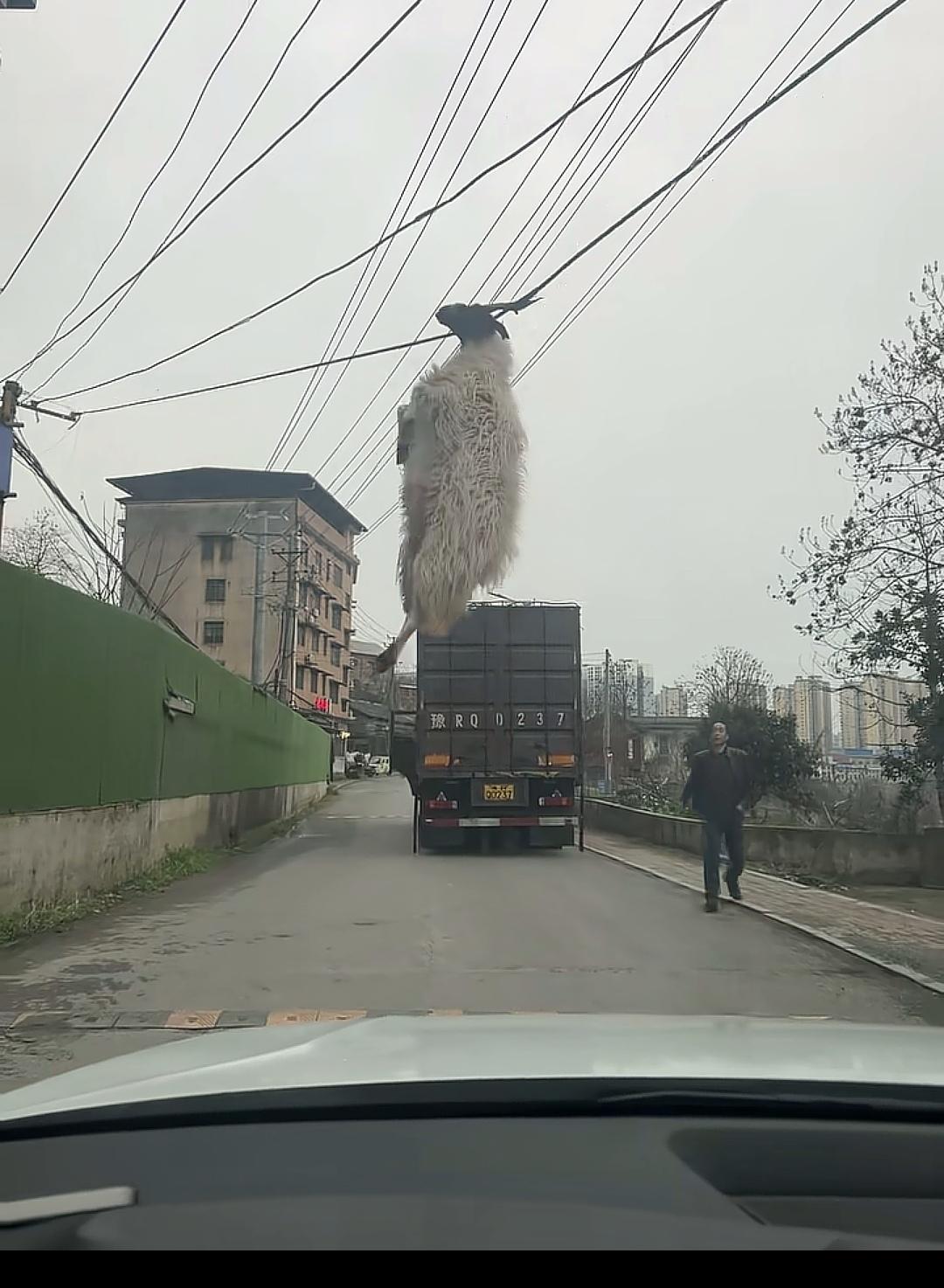 这只羊是怎么挂上去的? 看到一位网友发的车载视频录像,他跟在一辆货车后面,发现有一只羊挂在了道路上空的线缆上,而且那只羊还比较大,好在前面的货车发现了自己运的羊挂在空中线缆上,很快就停车下来找羊,但两个人身高太矮了,折腾了很久都没有弄下来,两只羊角牢牢地挂在线缆上。 那辆货车是运羊的,当时路过那个路段的时候,货车上的羊估计有应激反应,突然在货车上一跃而起,结果就非常巧合地挂在了上空的线缆上。