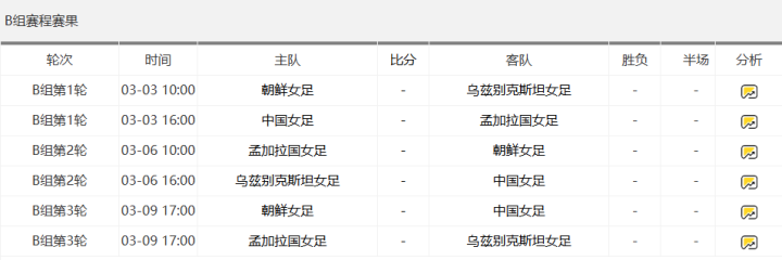 根据赛制,每组前两名和两个成绩最好的小组第三名将晋级八强。中国女足与孟加拉国、乌兹别克斯坦和朝鲜队同处B组,3月3日将迎来与孟加拉国队的首场小组赛。