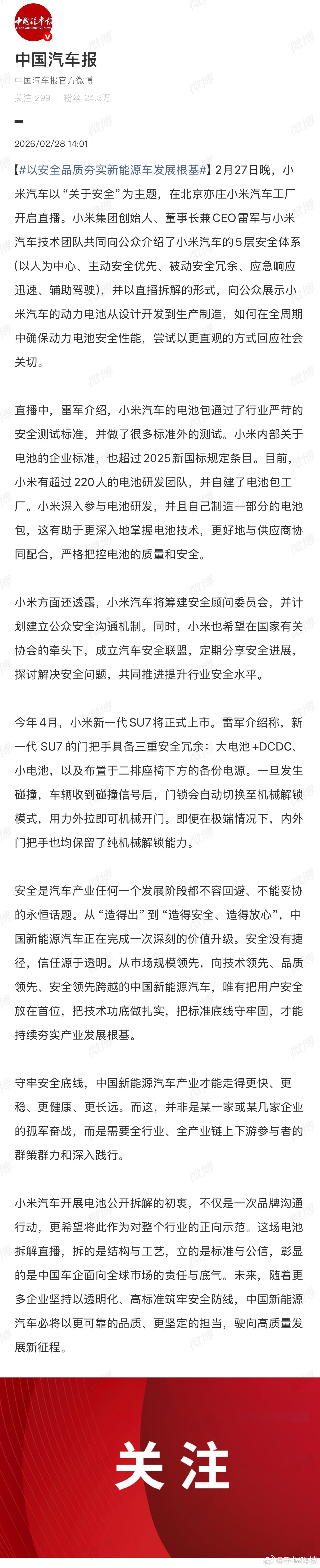 以安全品质夯实新能源车发展根基我感觉最近一两年国内汽车行业越来越理性了,之前可能大家都比较疯狂一些,更偏执于销量和技术,但现在大家越来越把安全放在了第一位。消费者是这样,车企更是这样。例如小米汽车对安全的投入都是真金白银实打实的投入。从顶层的安全决策,到研发、测试、生产的全链路防护,再到公开透明的沟通机制,每一步都在说 “安全是基础,安全高于一切”。说起来也是,安全没有什么捷径,车企把安全放在心上,才能真正赢得用户信任。而用户的新人,很大一部分来自企业的坦诚与透明。之前老款SU7安全成绩已经站在行业第一梯队,现在新一代SU7更是再进一步,在主动安全、被动防护、电池安全等多个维度不断加码。当然大家也要理性看待,任何技术都有边界,安全同样有极限。小米等各大车企能做的是在现有技术与法规框架内,把能做到的保护做到最好,尽自己最大努力保障用户安全。