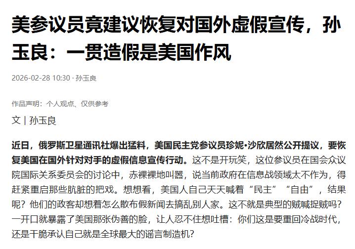 这个话怕不对吧?美国参议员建议恢复对国外虚假宣传? 问题是他们什么时候停止过? 美国又不是只有一个国际开发署。再说了,美国国际开发署只是换了一个上级领导而已,又不是将这个单位完全裁撤。该干的事一件也没有落下。 这个是你们美国的立国之本,以前你们的国务卿蓬佩奥公然说过的,全世界人民都知道。 可笑的是明知道你们是这样的货色,但是居然还有些货会相信。 不得不说,你们的远程畜牧业真的很发达,不得不服。 比如前几天,为中国夺金的中国女孩被你们上至国家副总统下至普通网红地攻击,为美国夺金的华人女孩被捧成人类精华。 有意思吧? 点右上角关注我,我们一起去看这个魔幻的世界