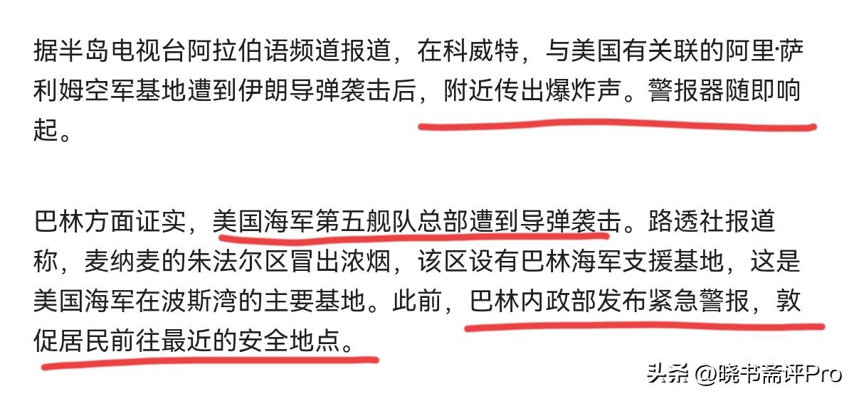 伊朗开始还击了!以色列境内遭到伊朗导弹打击,美国多个军事基地传来爆炸声!2月28日,根据外媒报道称,在美以联合空袭后,伊朗警告称将进行无休止的报复。以色列军方称,伊朗发射的导弹正飞向以色列,引发多个地区的警报。以色列空军正在拦截并在必要时打击威胁。军方同时提醒公众“防御并非万无一失”。 显然,伊朗的报复行动不仅限于以色列。在科威特,与美国有关联的阿里·萨利姆空军基地遭到伊朗导弹袭击后,附近传出爆炸声,警报器随即响起。巴林方面证实,美国海军第五舰队总部遭到导弹袭击。麦纳麦的朱法尔区冒出浓烟,该区设有巴林海军支援基地,这是美国海军在波斯湾的主要基地。 阿布扎比也发生剧烈爆炸。外媒表示目前冲突已波及以色列、巴林、科威特、卡塔尔和阿联酋这些有美军基地的地方。很显然,面对美以的突然袭击,以及特朗普要求伊朗放下武器,并投降的警告之后,伊朗的选择就是以眼还眼,以牙还牙。从伊朗的还击力度来看,这充分说明一点,伊朗对美以的偷袭是有准备的。 美国和以色列并没有对伊朗的反击能力形成完全的压制。现在伊朗既打击以色列本土,又打击美国的基地,这就是告诉美国,伊朗已经准备好了。伊朗的一名高级官员表示,美国和以色列在中东的所有资产和利益都已成为合法的攻击目标,在这次侵略之后,已经没有任何底线了。很显然,伊朗已经做好了放手一搏的准备。