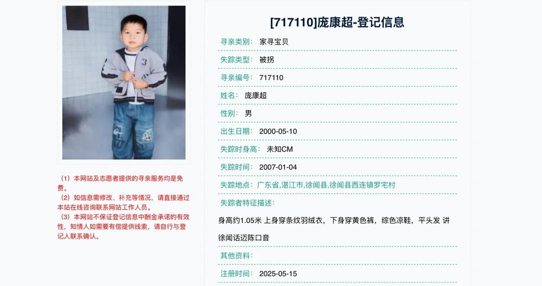 记住这个特征!寻亲编号717110,寻找被拐男孩 【爱心转发,助力团圆】 每一次转发,都可能为一个家庭铺就一条回家的路。 我们是宝贝回家志愿者,现协助发布寻亲信息,寻找庞康超。 🕰 核心寻亲线索 ▫️姓名:庞康超 ▫️性别:男 ▫️出生日期:2000年05月10日 ▫️失散时间:2007年01月04日(时年7岁) ▫️失散地点:广东省 湛江市 徐闻县 西连镇罗宅村 ▫️失散类型:被拐 🔍 关键特征提示 孩子走失时身高约1.05米,上身穿条纹绒衣,下身穿黄色裤子,脚穿绿色凉鞋,留着平头,讲徐闻话迈陈口音。 如今,当年7岁的小男孩,已经长成25岁的青年。他的家人从未停止寻找,每一个日夜都在期盼着一丝线索。 如果您是广东徐闻及周边的居民,或是在2007年前后见过相似特征的孩子,亦或是有任何关于“庞康超”的蛛丝马迹,请务必联系我们! 您的一次点赞、转发,就是给这个家庭最珍贵的希望。愿亲情跨越岁月,让庞康超早日与家人团聚。 📌 寻亲编号:717110 📌 跟进志愿者:小方 宝贝回家 公益寻亲 广东湛江 徐闻寻亲 寻找被拐男孩 庞康超