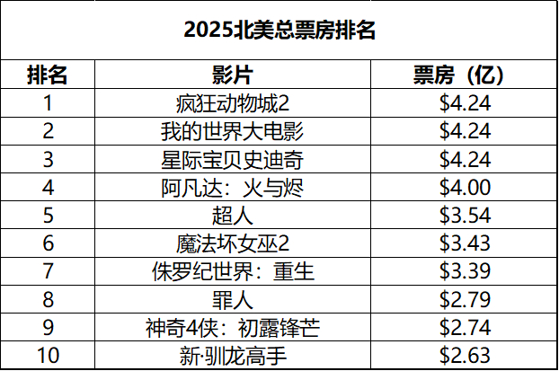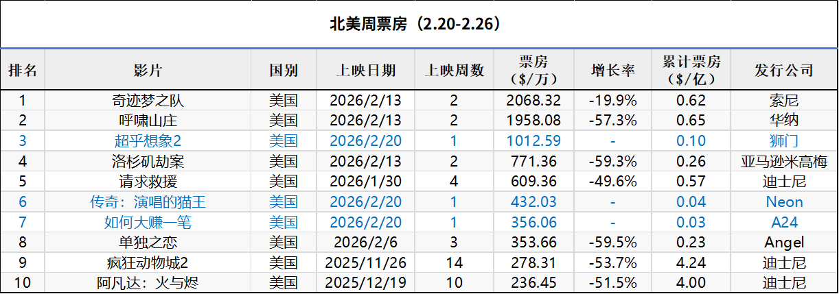 2026年第8周北美票房 :1.《疯狂动物城2》北美累计票房超越《我的世界大电影》成为2025年冠,全球票房18.5亿美元;2.《阿凡达3》北美票房破4亿,全球票房14.74亿;3.《奇迹梦之队》公映次周凭借更小的跌幅夺冠。(数据:boxofficemojo)