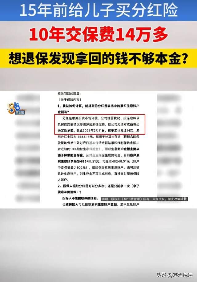 宁波,林女士有一份15年前买的分红型保险,每年交14750元,交了10年。如今儿子上大学,她去退保时却发现:交了将近15万的本金如今只剩下8万多,分红也只能拿到47000元,这到底是怎么一回事? 林女士是2011年购买的新华保险“好利年年两全保险(分红型)。那时,林女士的儿子刚满4岁。一位保险业务员上门推销,说这款产品收益很不错。 当时业务员对林女士保证道“两年拿一次分红,你要拿钱就去拿。不拿也可以,等小孩读大学了,有一笔钱,大学学校的费用全部可以包括在里面。” 冲着这份“教育金保障”,林女士每年交14750元,一共交了10年,总计保费147500元。 2025年,林女士的儿子考上了大学,读的是民办学校,每年学费三万多。林女士想起当年业务员的承诺,兴冲冲地去保险公司查看账户,想取钱给孩子交学费。 结果让她傻眼了:账户里可提取的分红只有47000多元。 这点分红只够交一年学杂费的,林女士就想咨询退保。结果算了算账,发现这时候退的话,拿回来的钱还没有这些年交的本金多。 面对147500的本金变成8万多,分红钱只得4万多的结果,李女士实在无法接受。 她找到当年的业务员俞女士,对方却表示“我老早忘记了,那么多年。我做了几个月就不做了”。 随着事情在网上的发酵,当记者联系上这位前业务员,她坦言:“我们那会也是刚刚做这项业务,也不是很理解这种保险。”至于当年具体怎么跟林女士说的,她已经记不清了。 这位业务员建议林女士再好好看看合同,弄明白到底是怎么一个事情。 为什么明明交了十几万,退保时本金只剩8万?分红也只有4万多,钱都去哪了? 原来林女士每年交的14750元保费,其实不是全部存起来了,而是被分成了三份: 第一份是买保障的成本,分红险本质还是保险,不是银行存款。 保险公司要承担林女士儿子的风险保障(比如身故保障),这部分钱是要扣掉的。就像买车险,你交的钱一部分是买保障,不是存钱。 第二份是保险公司的“手续费”。 包括业务员的佣金、保险公司的管理费、运营成本等。尤其是前几年,大部分保费都拿去支付这些费用了。这也是为什么前几年退保几乎拿不回钱的原因。 第三份才是用来投资产生分红,也就是林女士的147500元扣完上面两笔,剩下的钱才进入投资账户,用来产生分红。 所以这就是为什么15年后分红只有4万多的原因。真正用来投资的钱本就不多,大部分都用来交了保障费和手续费,加上投资收益率也不是很高,所以分红自然也就少。 那为什么十几万的本金只剩下8万多呢? 这关键要看合同条款里的一个名词“现金价值”,即“如果现在退保,保险公司能退给你的钱。” 现金价值不是等于你交的总保费,而是逐年增长的。比如第一年你交14750元,现金价值可能只有2000元(因为大部分被扣掉了)。 随着交费年限增加,现金价值慢慢上涨,但前十几年一直低于你交的总保费。 林女士交了10年,总保费147500元,但到她退保时,这份保单的现金价值只涨到了8万多,加上分红4万多,总共13万出头,所以还是亏损了。 打个比方: 就像你租房子,每月交3000房租,交了10年一共36万。 但退租时房东不可能退你36万,因为房租是你租房子住的费用,不是存款。 保险的保障成本和运营成本,就相当于这个“房租”。 所以林女士是2011年购买的保险,2025年要用钱,正好卡在一个尴尬的时间点——现金价值还没涨回保费,分红积累也不够多。 简单来说,分红型保险放得越久,能拿的钱越多,如果放66年,参考的累计生息账户金额是63万多。 最终,在深入了解保险收益规则后,林女士决定先不退保了。毕竟如果现在退保,不仅拿不回本金,还失去了未来继续增值的机会。 放得越久,分红和现金价值会逐步增长,等到保单期满,总收益可能远超保费。 对此,您怎么看?欢迎留言交流。 来源:1818黄金眼