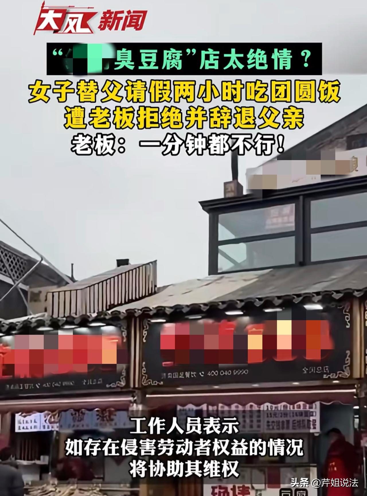 山东济南,一女子替即将回外地工作的父亲向臭豆腐店老板请假2小时吃团圆饭,并主动提出扣除对应时段的工资,没想到,老板不仅一口回绝还说说一分钟都不行,甚至转头就直接把父亲给辞退了! 事情发生在2026年2月21日,农历正月初五。 李女士正月初六就要启程回杭州上班,临走前唯一的心愿,就是和父亲好好吃一顿团圆送别饭。 她的父亲,是济南宽厚里一家臭豆腐门店的炸锅师傅。 整个春节期间,父亲只在年前除夕休息了一天,剩下的时间全在店里上班,忙到凌晨也是常有的事。 为了不影响店里的生意,李女士特意挑了当晚11点后,门店客流量最少的时段,给老板打了电话。 她在电话里说得明明白白,想替父亲请假2小时,还主动提出,愿意全额扣除这2小时对应的工资,一分钱便宜都不占店里的。 可让她万万没想到的是,老板不仅直接就回绝了她的请求,态度还差得离谱。 别说请假了,一分钟也不行! 两人不欢而散。 更让人生气的还在后头,在挂了李女士的电话之后,老板转头就打给了她的父亲,当场就把人给辞退了。 李女士说,父亲是店里的核心员工,平时工作勤恳,就算家里有事也极少请假,没想到就因为这么一件不算事的事,就这样不明不白地丢了工作。 又生气又憋屈的李女士,直接赶到了涉事门店,在店门口当场控诉老板太不讲道理了。 有网友拍下了现场的视频,发布到网络上后,很快就引发了全网的广泛关注,数万网友留言支持李女士为父亲维权。 本以为商家会因此收敛,但随后商家面对记者的采访却是又一次让人血压飙升,那股嚣张的气焰隔着屏幕都能感觉得到! 一名工作人员接到记者的电话后,居然不分青红皂白张口就怼,关你什么事! 说完,“啪!”的一声就挂断了电话。 还有另一名门店员工一口咬定,说李女士发布的都是不实信息。 可记者仅仅只是追问了一句具体哪里不真实了,对方就开始支支吾吾,最后只说出个“这个没必要告诉你”。 对此,历下区人社局也很快就展开了行动。 协同历下区大明湖街道办一同调查相关情况。其中,着重关注商家是否存在违反劳动法律法规的行为。 工作人员还明确表态,如查实存在侵害劳动者权益的情况,将协助当事人依法维权。 根据《劳动合同法》第三十九条明确规定,用人单位可以单方解除劳动合同的法定情形,只有劳动者存在严重违反用人单位的规章制度、严重失职,营私舞弊,给用人单位造成重大损害等情况,用人单位才可以合法辞退员工。 换句话说就是,老板想随便开除员工,必须符合法律明确规定的情形,不是他想辞就能辞的。 对应到这件事里,员工只是申请2小时的事假,还特意挑了客流最少的时段,主动要求扣除对应工资,既没有耽误门店的正常经营,也没有给店理造成任何损失,完全不在合法辞退的范围内。 门店仅凭不准假就直接开除员工,属于典型的违法解除劳动合同。 按照《劳动合同法》第八十七条规定,用人单位违反本法规定解除劳动合同的,应当依照本法第四十七条规定的经济补偿标准的2倍向劳动者支付赔偿金。 也就是说,李女士的父亲不仅可以要求门店补发拖欠的工资,还可以主张违法解除劳动合同的双倍赔偿金,每干满1年就能拿到2个月的工资赔偿。 同时,《劳动法》第四十四条还规定了,法定休假日安排劳动者工作的,支付不低于工资的百分之三百的工资报酬。 说白了,春节法定节假日上班,必须给3倍工资,不能用补休抵消。 而李女士的父亲在整个春节假期中都才只休息了一天,门店必须依法足额补齐所有的加班费,少发、不发都属于违法行为。 但是对于这件事,网友们却并不是都站在李女士的那边。 有网友站在店长的角度思考,觉得这种临时请假,身为管理者没办法短时间内就找到其他人来替换。 而开门做生意,准时开关门非常重要,如果人少就提前关门,客人只会越来越少。 但大部分网友还是觉得,店长这样也还是太不近人情了,就2小时的假,还是挑的没人的时段,就这样把人给开除了,实在是没必要。 对此,您觉得哪边说得有道理?欢迎留言交流。 来源:大河报、大风新闻