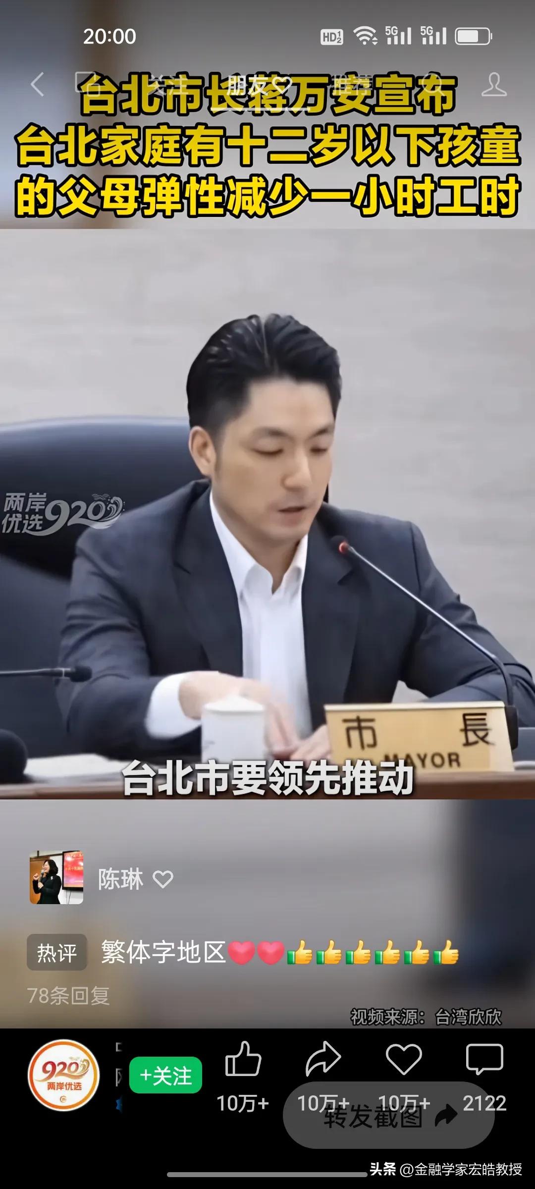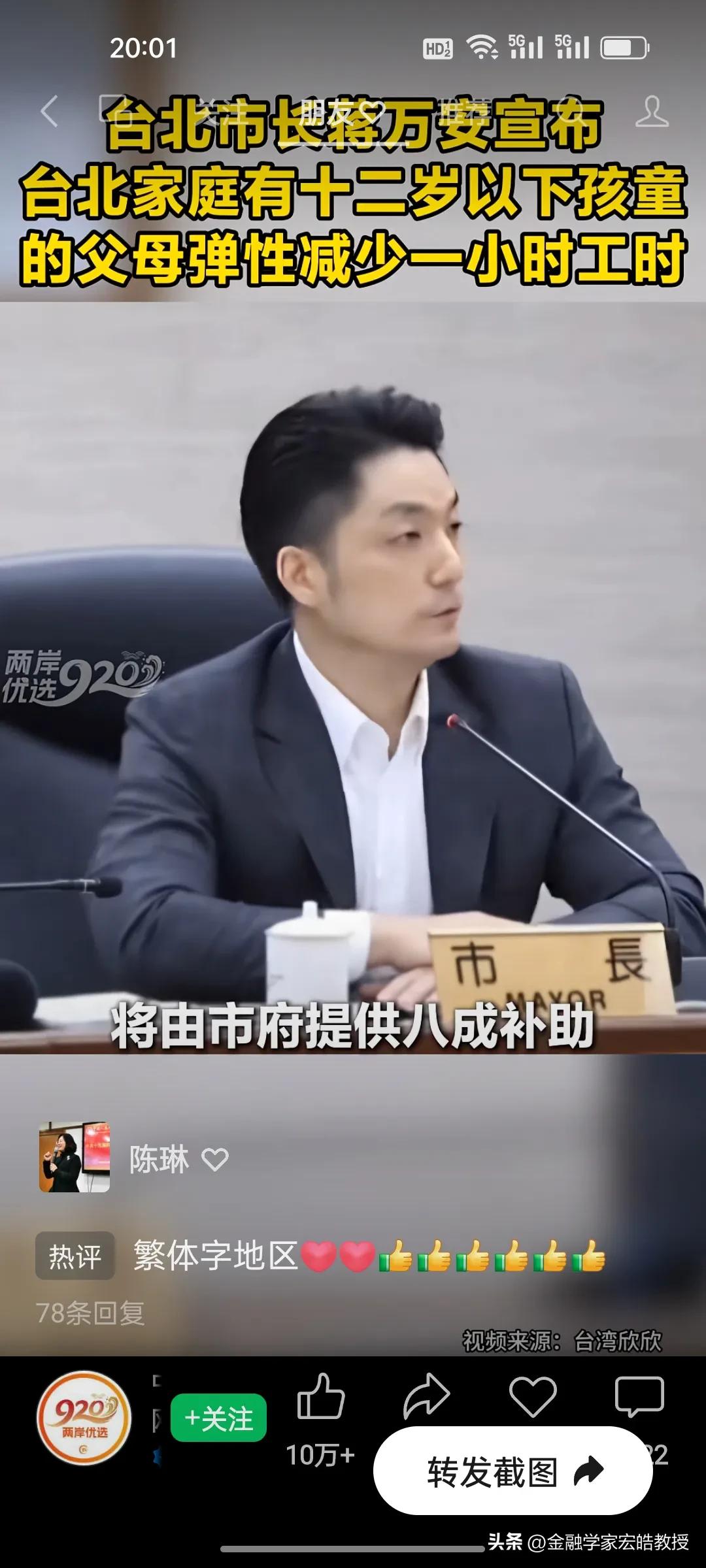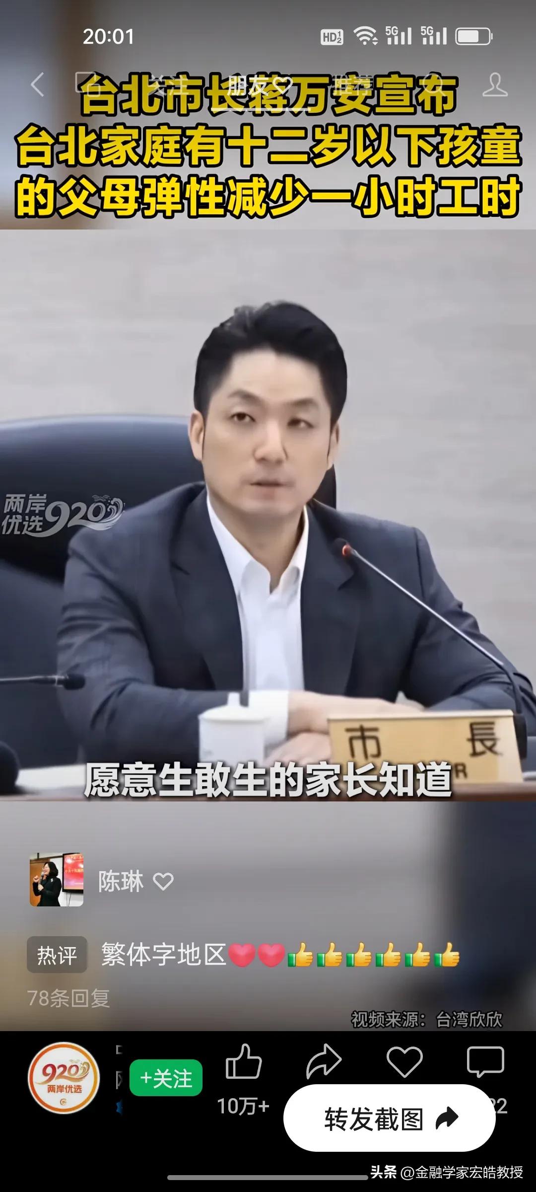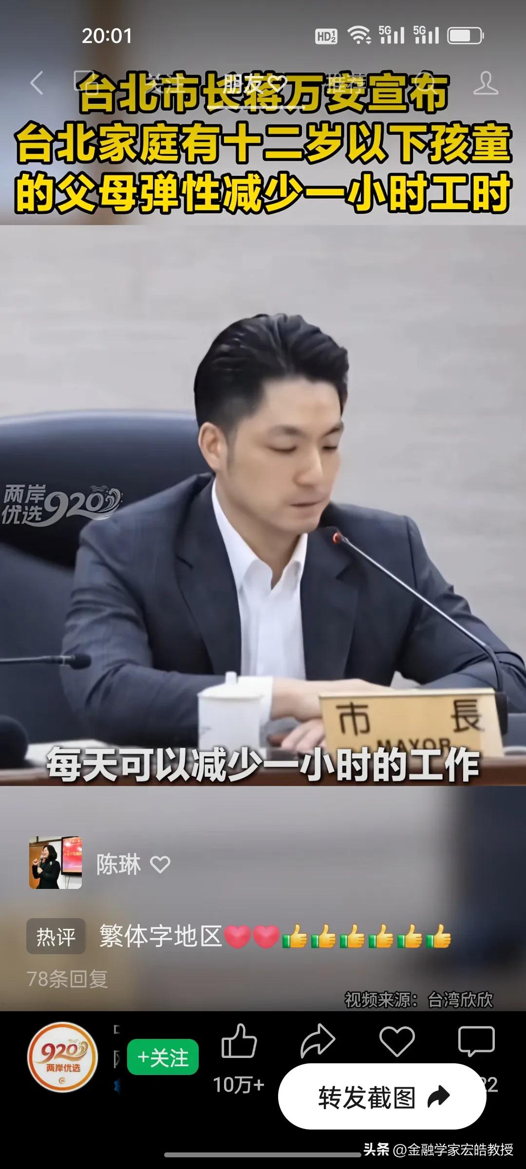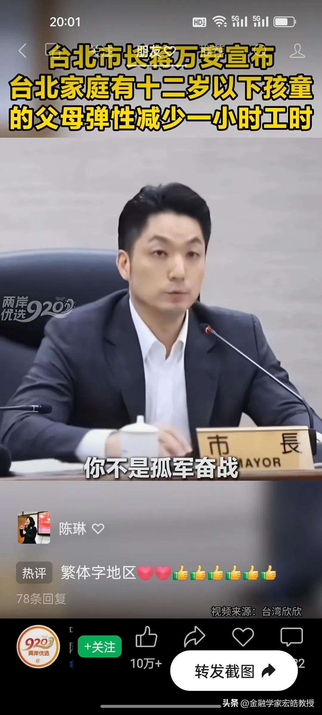 台北市长蒋万安官宣重磅新政明天起实施,12岁以下孩童父母直接受益,这波得人心的操作又圈粉了! 台北育儿家长的“接娃焦虑”,终于有了破局方案!蒋万安官宣重磅新政,明天3月1日起正式落地。 新政直击痛点:家中有12岁以下孩童的父母,可弹性减少每日1小时工时,且企业不得减薪,差额由市府补贴八成。家长能自主选择早到或晚退,精准匹配孩子上下学时间,彻底告别赶场接娃的慌乱。 这一举措既给企业减负,又给家长松绑,实实在在解决了民生难题。正如蒋万安说“让每一位敢生愿生的家长知道,在台北培养下一代,你不是孤军奋战。” 网友纷纷点赞这位得民心的市长:这才是为民办实事的样子,期待政策顺利落地,让育儿家庭真正受益!