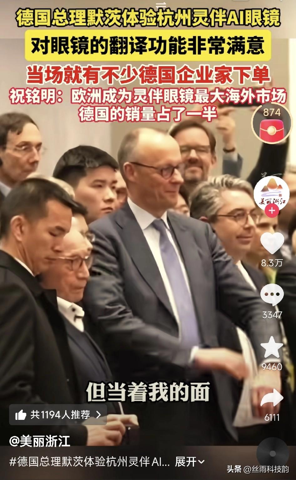 最近杭州灵伴AI眼镜彻底火了,德国总理默茨体验后赞不绝口,现场直接推荐,跟着来的七八位德国企业家当场就下单! 灵伴科技创始人祝铭明也透露,现在欧洲已经是灵伴眼镜最大的海外市场,其中德国销量就占了一半,相当于欧洲每卖两副,就有一副是卖到德国的。能让一向严谨、挑剔的德国人认可,足以说明咱们的技术和体验真的过硬。 这款眼镜最打动默茨的就是实时翻译功能,中文说话,眼镜里直接出德语,又快又准,跨国交流毫无障碍。对于经常出差、谈判、旅游的人来说,简直是神器。 这可不是简单的网红产品走红,而是中国硬科技的实力出圈。以前我们总羡慕国外的黑科技,现在轮到中国AI眼镜被外国总理主动体验、现场带货。灵伴眼镜只是一个开始,我相信未来会有更多中国科技品牌,在世界舞台上大放光彩。 科技