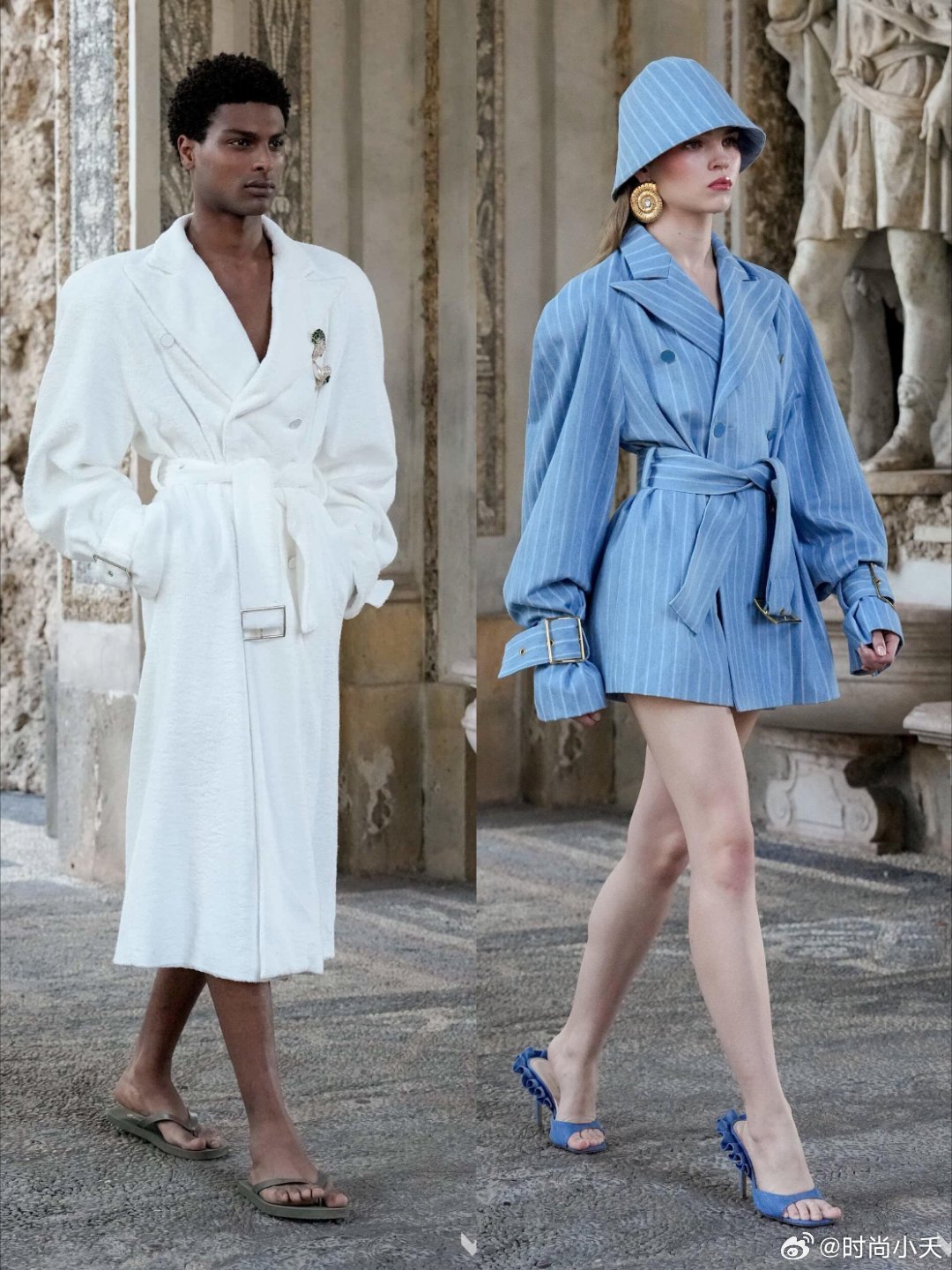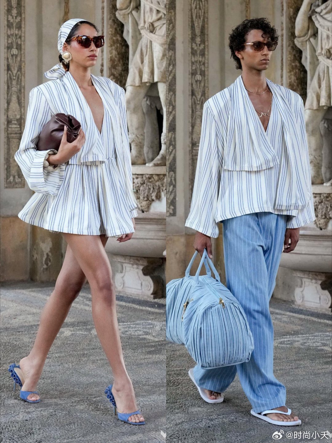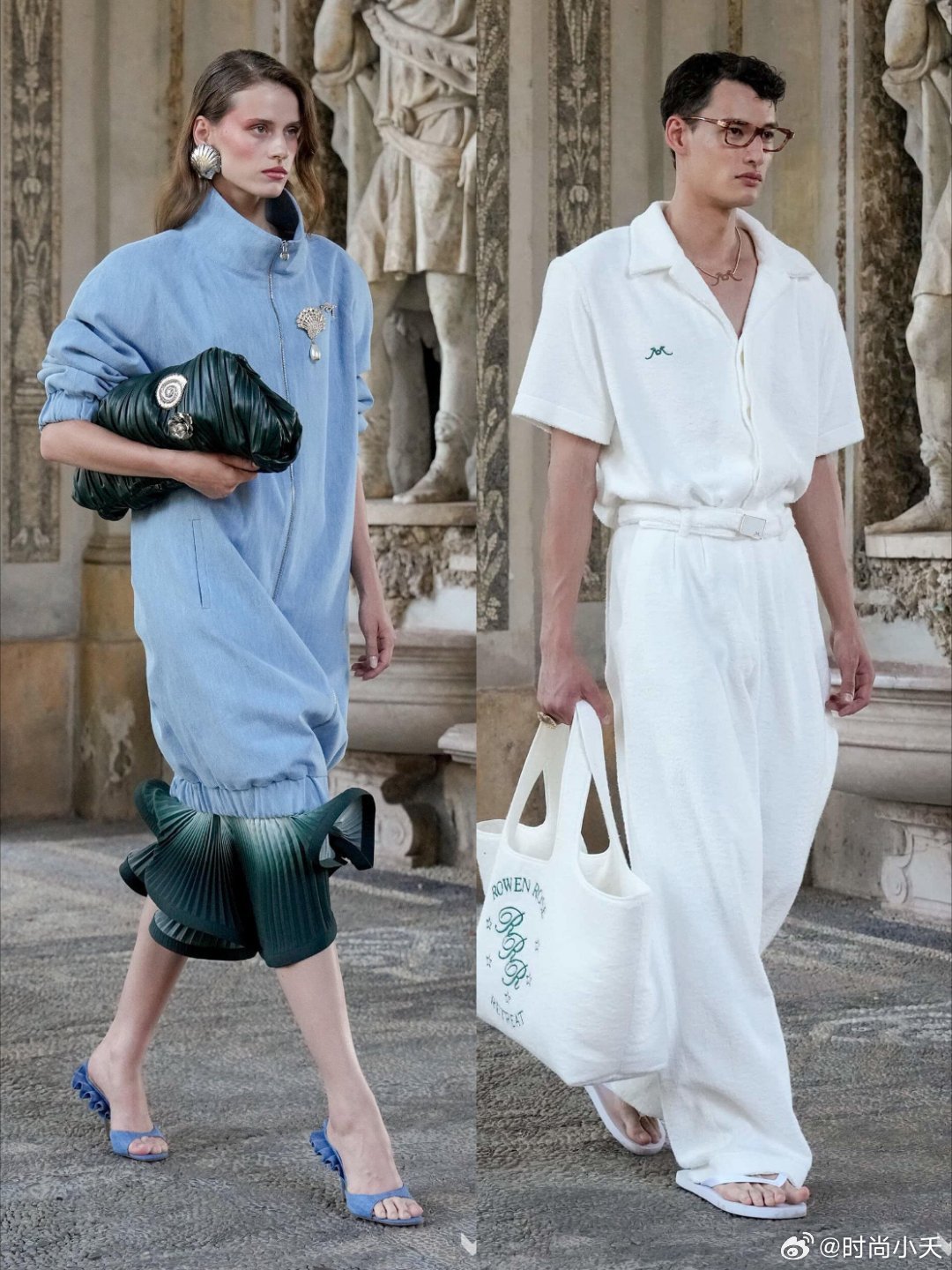 Rowen Rose 2026ss这秀场细节太可了米兰时装周时装周普通人怎么看时装周设计灵感源自古罗马/古希腊公共浴场文化,提炼“仪式感与松弛感。这场秀有一种雕刻美,主打法意混血美学与二元对立的设计哲学,男女混合秀场,利用白色和高饱和的蓝色为基调,搭配绿色、陶土棕等营造一种度假氛围。