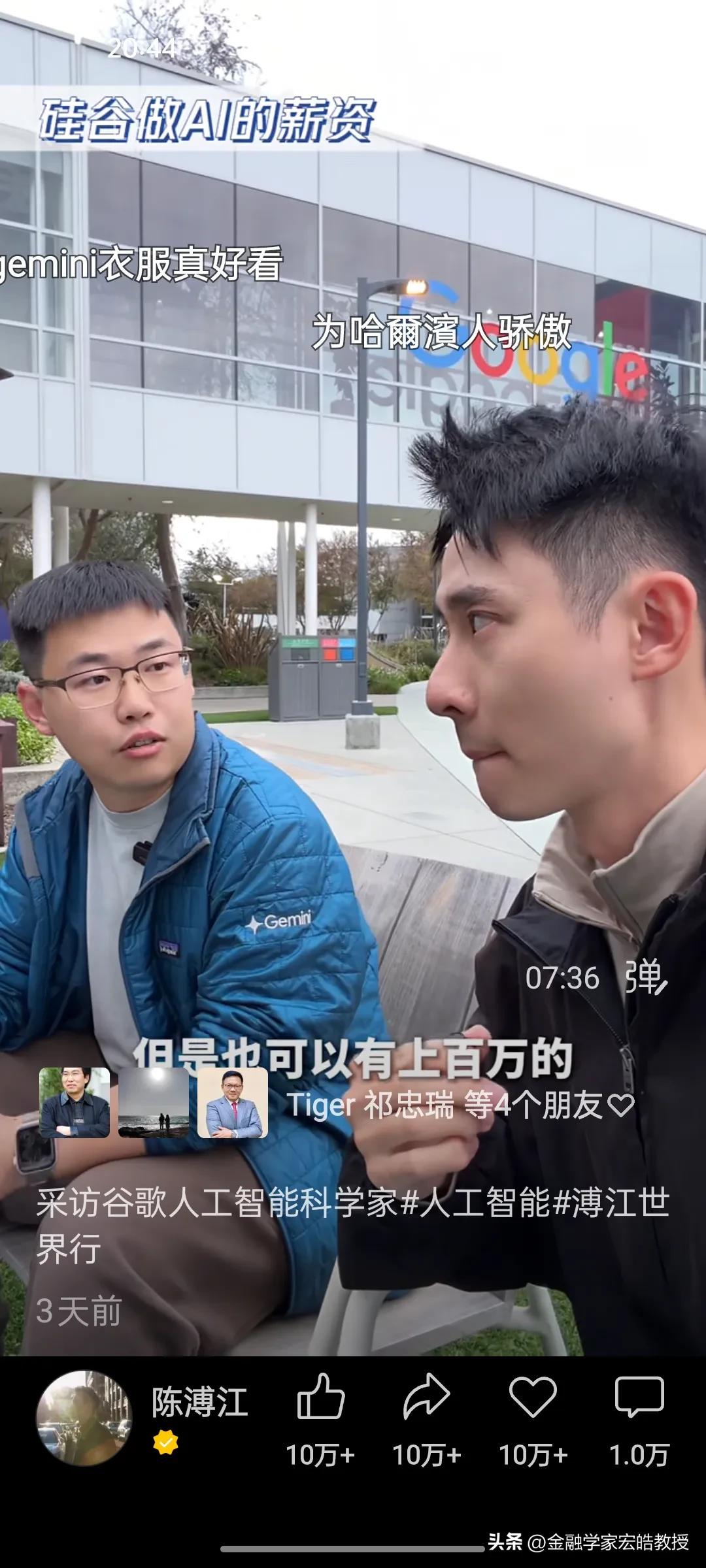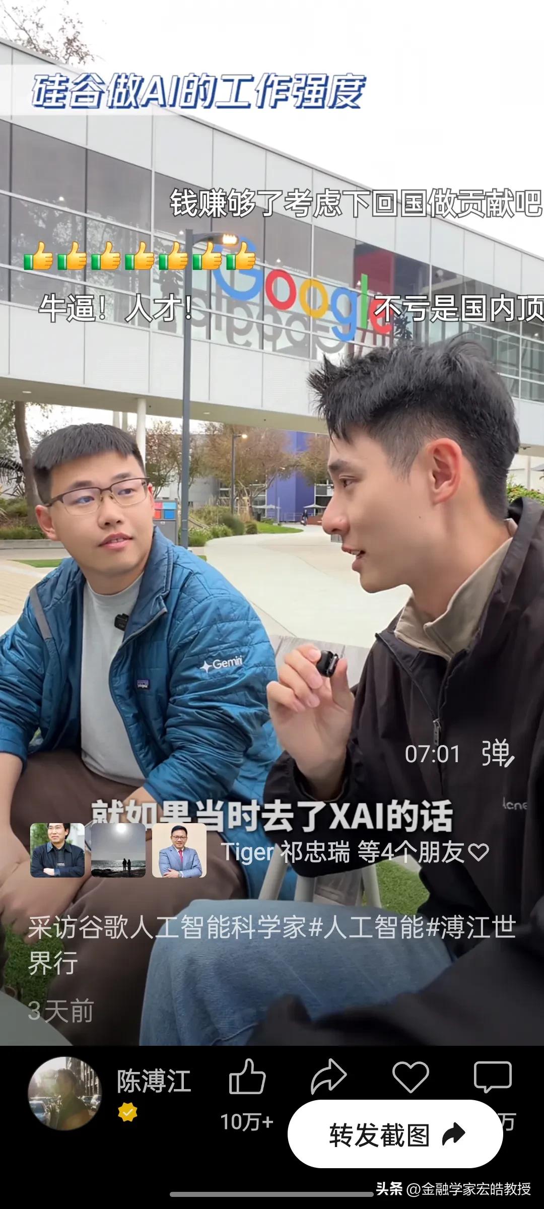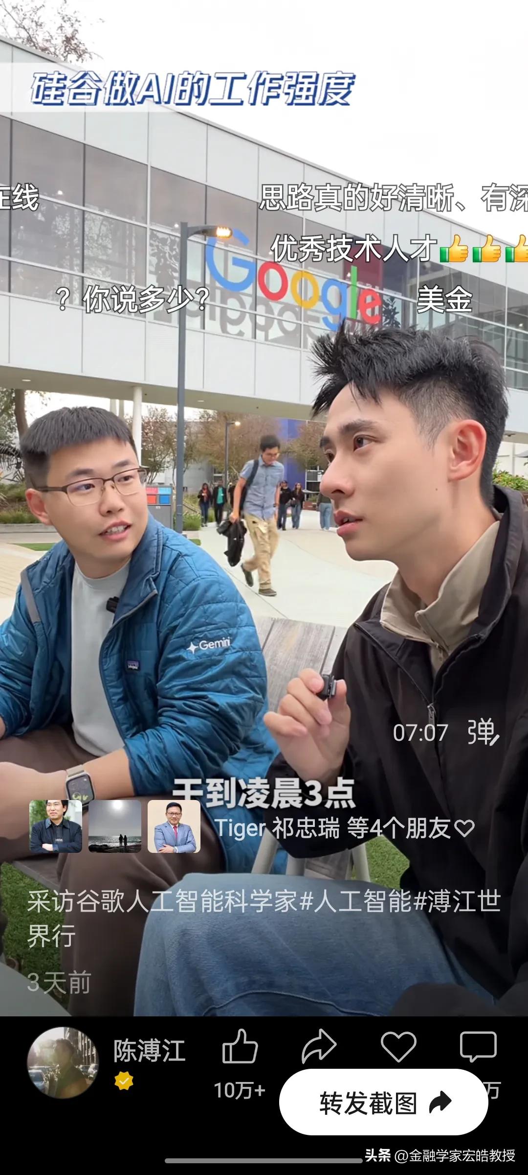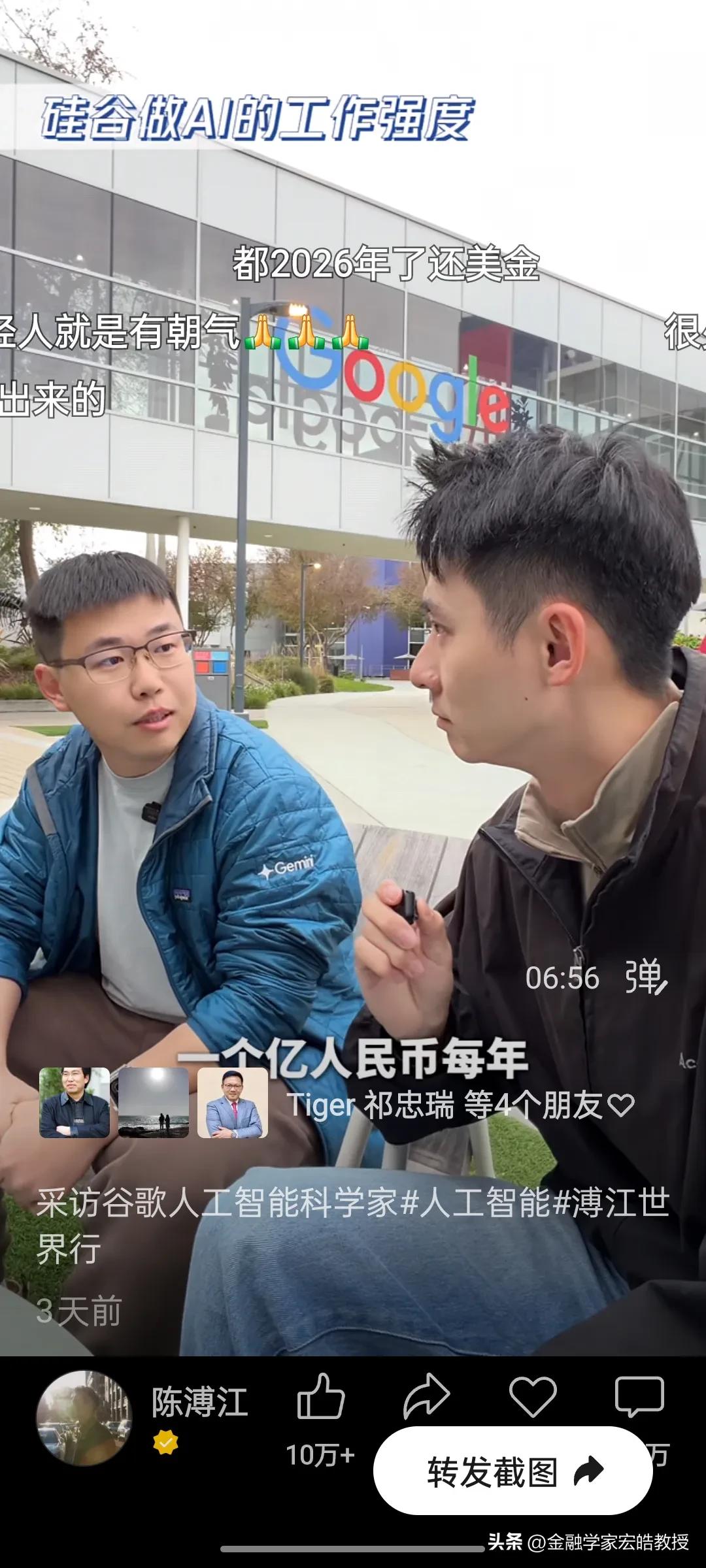 清北学霸在硅谷干AI工作年薪千万?真相扎心了! 刚刚看到陈溥江三天前在谷歌总部采访Gemini的AI科学家于力军的视频火了,里面的几个数据,直接戳破了很多人对硅谷的想象。 于力军透露,他是北大计算机专业本科毕业去美国卡耐基梅隆大学读博士,这所大学在计算机、AI领域是世界天花板级别。他毕业后去马斯克的XAI面试过,也去字节跳动跟张一鸣面试过,像他这样的AI人才,如果去马斯克的公司,年薪能到1亿人民币,而在谷歌这类大厂,普通AI从业者的年薪也在100万到1000万美金之间,上不封顶。当然有的公司要从早上十点干到半夜三点,一周要工作八九十个小时,工作强度很大,比中国还要卷。更扎心的是,他说清北毕业的AI人才,在硅谷一抓一大把,很多人早已成为核心团队的顶梁柱。 一边是高薪诱惑,一边是祖国召唤。今天看到西湖大学官宣了20位90后博导,其中八成都是美国高校博士毕业,也有美国卡耐基梅隆大学博士毕业的。这些顶尖人才的选择,不仅关乎个人发展,更关乎国家科技未来。我们期待更多“于力军”们,带着技术和经验回国,让中国AI真正领跑世界!
