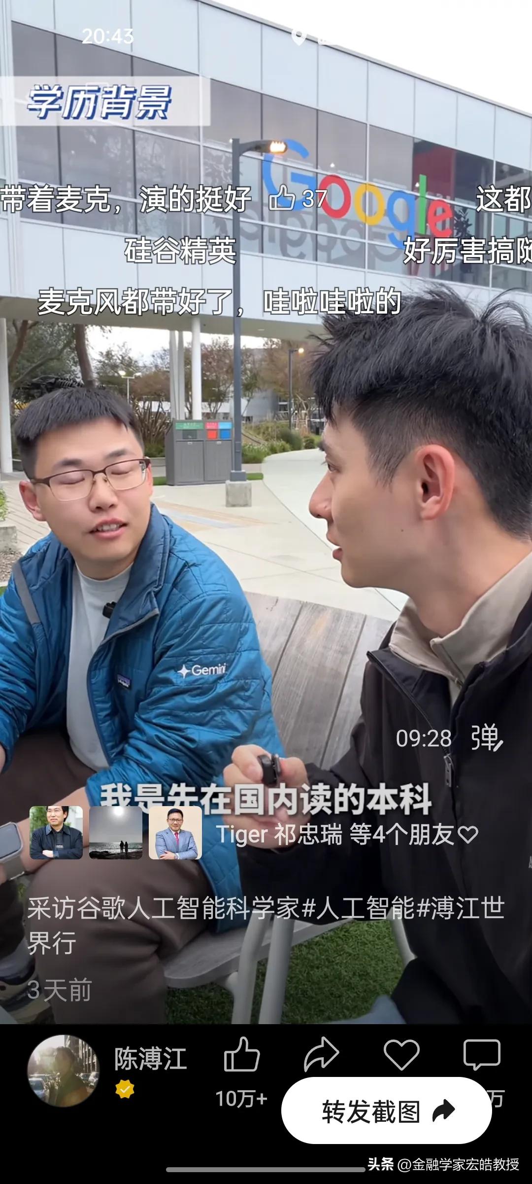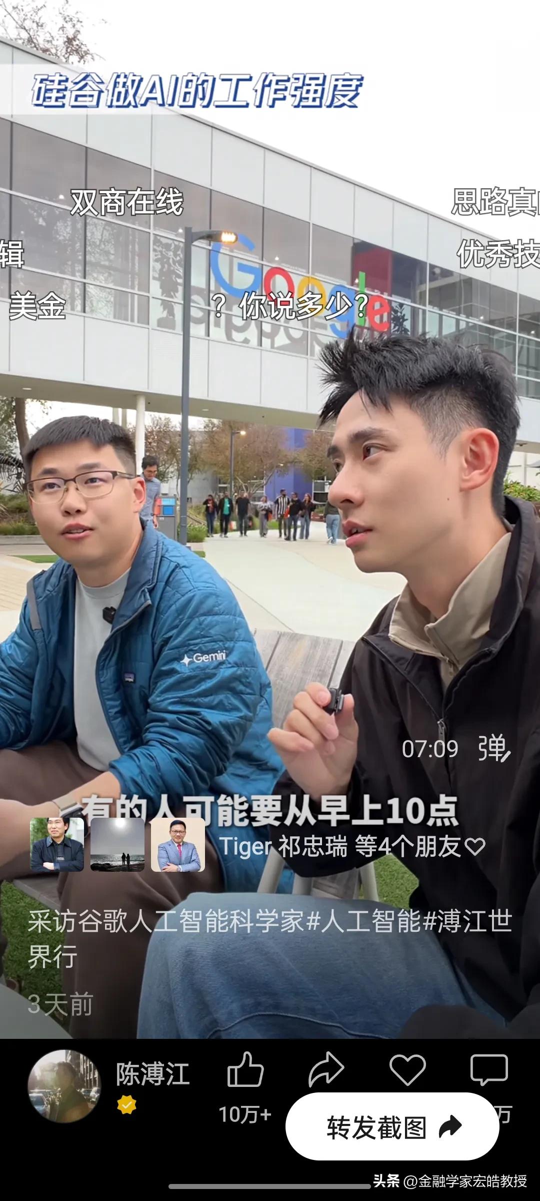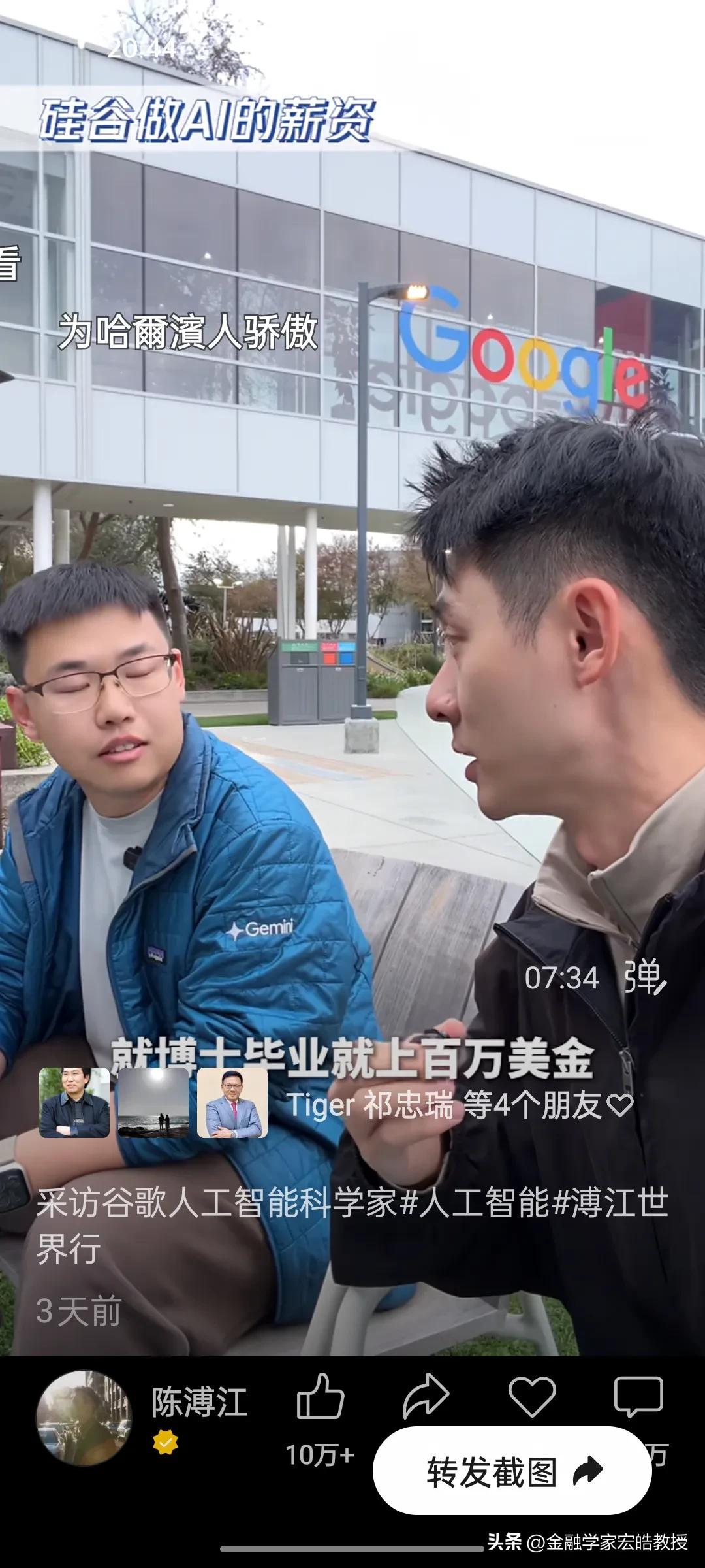 清北学霸在硅谷干AI工作年薪千万?真相扎心了! 刚刚看到陈溥江三天前在谷歌总部采访Gemini的AI科学家于力军的视频火了,里面的几个数据,直接戳破了很多人对硅谷的想象。 于力军透露,他是北大计算机专业本科毕业去美国卡耐基梅隆大学读博士,这所大学在计算机、AI领域是世界天花板级别。他毕业后去马斯克的XAI面试过,也去字节跳动跟张一鸣面试过,像他这样的AI人才,如果去马斯克的公司,年薪能到1亿人民币,而在谷歌这类大厂,普通AI从业者的年薪也在100万到1000万美金之间,上不封顶。当然有的公司要从早上十点干到半夜三点,一周要工作八九十个小时,工作强度很大,比中国还要卷。更扎心的是,他说清北毕业的AI人才,在硅谷一抓一大把,很多人早已成为核心团队的顶梁柱。 一边是高薪诱惑,一边是祖国召唤。今天看到西湖大学官宣了20位90后博导,其中八成都是美国高校博士毕业,也有美国卡耐基梅隆大学博士毕业的。这些顶尖人才的选择,不仅关乎个人发展,更关乎国家科技未来。我们期待更多“于力军”们,带着技术和经验回国,让中国AI真正领跑世界!