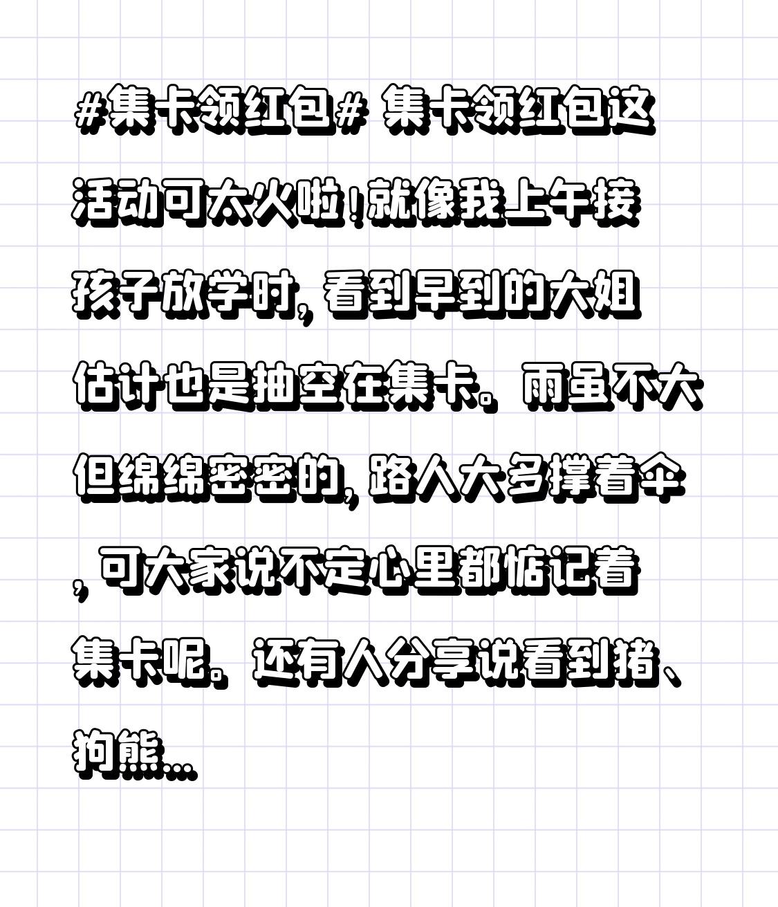 集卡领红包这活动可太火啦!就像我上午接孩子放学时,看到早到的大姐估计也是抽空在集卡。雨虽不大但绵绵密密的,路人大多撑着伞,可大家说不定心里都惦记着集卡呢。 还有人分享说看到猪、狗熊和兔子这几只可爱的小动物,它们是好朋友的画面。集卡就像一场寻宝游戏,每集到一张卡,就离红包近了一步。说不定哪天运气爆棚,一下子集齐所有卡,那红包就稳稳到手啦!这种小期待,还挺让人兴奋的呢。