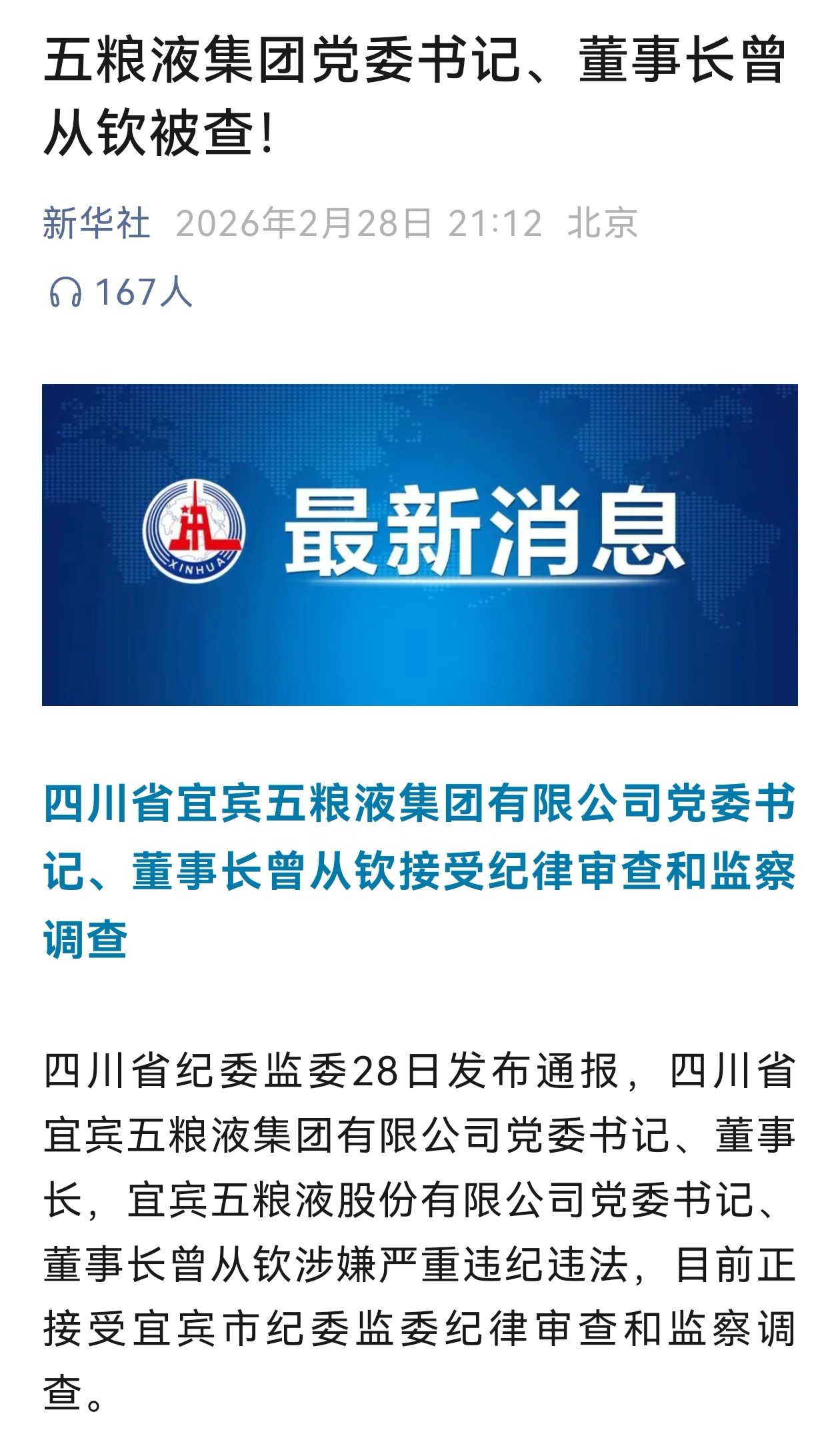 五粮液集团“一把手”曾从钦被查,五粮液官网已将曾从钦从“集团(股份)领导名单”中移除。曾从钦最后一次公开露面是在2026年2月24日。当天,五粮液集团(股份)公司召开2026年春节节后收心会,曾从钦作为集团一把手照常出席并讲话。五粮液董事长曾从钦被查满谈人物