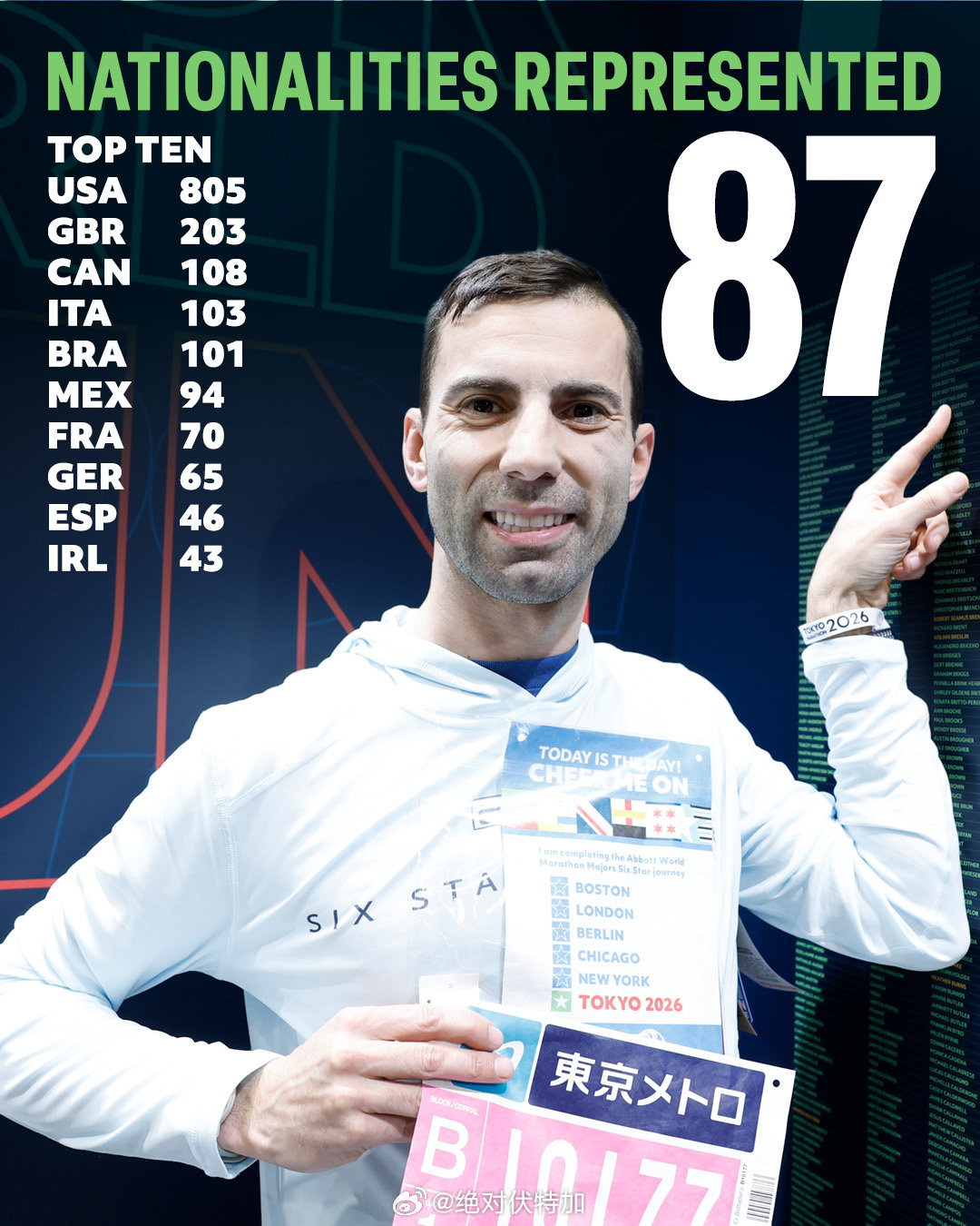 世界马拉松大满贯的2026东京马拉松展望:2159名潜在首轮六星跑者,其中6人刚好过生日;年龄最大者82岁11个月,年龄最小者21岁7个月;他们来自87个国家,最多人数分别属于美国(805人)、英国(203人)……中国是跑六大的刚好过了首轮热潮啊,竟然前十不入;金牌俱乐部成员则独占60人;新出现六星跑者的国家是阿塞拜疆、格林纳达、马拉维和圣马力诺。另有67名多轮六星奖牌潜在获得者。
