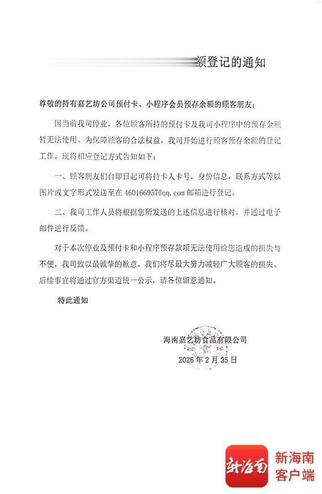 2月28日,记者发现,嘉艺坊的企业公众号以及海口市区内的部分门店公布了《关于预付卡/小程序预存余额登记的通知》,告知广大消费者该公司目前已处于停业状态,消费者所持有的该公司预付卡及小程序会员预存余额暂无法使用。为切实保障消费者合法权益,嘉艺坊已正式启动预存余额登记工作,明确了具体登记方式及相关事宜。