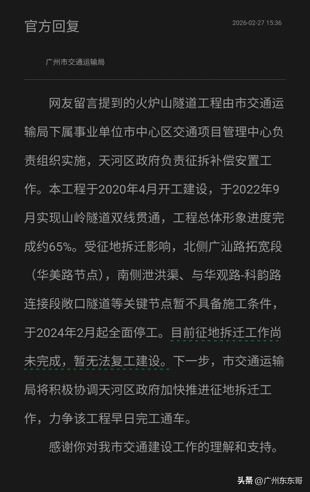 火炉山隧道什么时候能通车?最新回应来了! 近日,有市民建议加快火炉山隧道工程通车,提高附近居民出行便利性。 广州市有关部门对此也做出了积极回应: 1、火炉山隧道工程总体形象进度完成约65%。 2、受征地拆迁影响,北侧广汕路拓宽段(华美路节点),南侧泄洪渠、与华观路-科韵路连接段敞口隧道等关键节点暂不具备施工条件,于2024年2月起全面停工。 3、目前征地拆迁工作尚未完成,暂无法复工建设。 虽然推进比较缓慢,但是火炉山隧道工程已经被天河区列入2026年重点项目,有望在征地拆迁方面迎来新的突破!