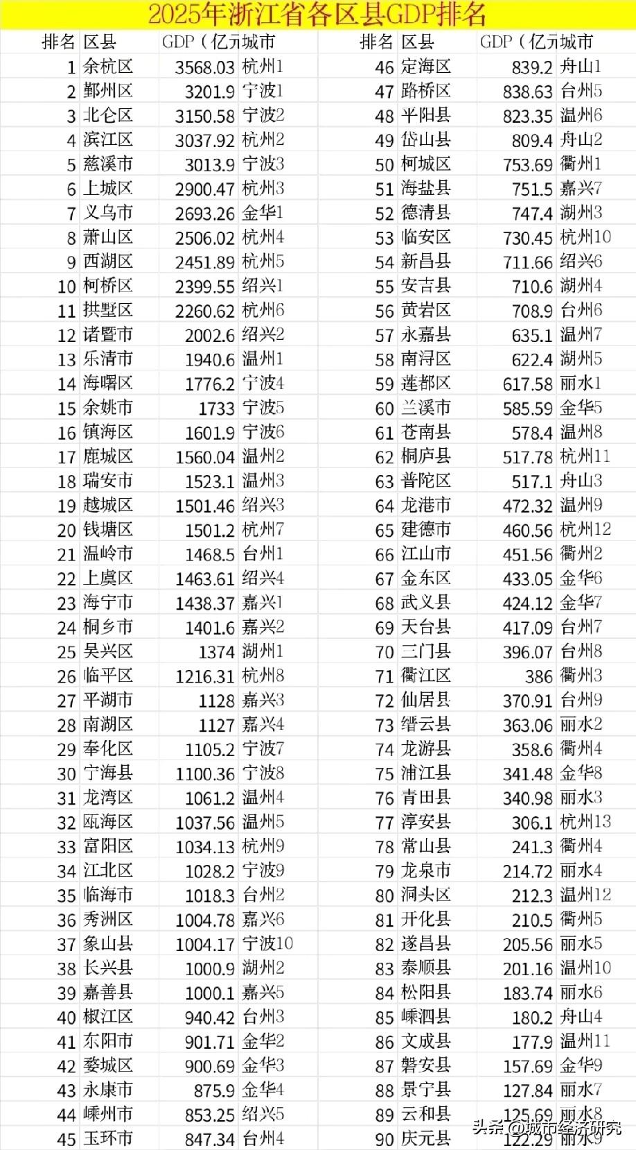 浙江省的千亿区县市数量真多呀,图片里属于2025年浙江各区县市的GDP数据,从图片数据可以看出,浙江2025年已经有39个区县市的GDP能够达到1000亿元人民币以上的水平,可见浙江千亿区县市数量还是挺多的,随着浙江各区县市经济的继续发展,浙江未来很有希望拥有更多GDP达到千亿元人民币以上的区县市,相信浙江各区县市经济未来有望发展的更为优秀。