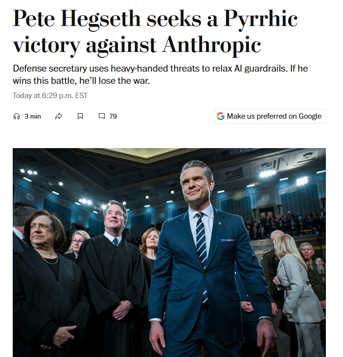 据报道,《国防生产法》赋予联邦政府广泛权力,可以强制私营企业优先考虑国家安全需求。而美国政府上一次援引这一法律是在新冠疫情期间。而被列为“供应链风险”企业,则意味着所有签有军事合同的公司在其任何军事相关工作中都不得使用Anthropic的产品。阿莫迪在他的文章中说,“这一标签以往只用于美国的对手,从来没对美国企业使用过”。