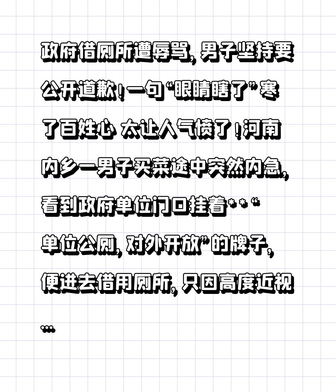 政府借厕所遭辱骂,男子坚持要公开道歉!一句“眼睛瞎了”寒了百姓心 太让人气愤了!河南内乡一男子买菜途中突然内急,看到政府单位门口挂着**“单位公厕,对外开放”的牌子,便进去借用厕所,只因高度近视没看清标识,多问了一句,竟被工作人员当场辱骂:“你眼睛瞎了吗?”** 男子本想好好沟通,对方更是嚣张回怼:“我还把你当神敬嘞?”“你今天就是闲着没事干!”甚至还关门阻拦,态度极其恶劣。 一块便民牌子挂在墙上,一句暖心服务喊在嘴上,可当老百姓真的遇到困难、需要方便时,得到的不是帮助,而是恶语相向、当众羞辱。换作是谁,心里都凉透了。 男子没有忍气吞声,他保留视频、拨打12345热线投诉,坚持要求公开道歉、公正处理。很多人劝他:不就是上个厕所、被骂一句吗,算了吧。但他偏不——今天问路借厕所能被骂,明天老百姓来办事,岂不是更要受气? 转折点来了! 在舆论关注下,当地官方迅速通报:情况基本属实!涉事人员是单位门卫,已责成其向男子公开道歉,并依规处理,同时全单位开展作风整顿。 直到这一刻,男子才等到他想要的公道。他要的从不是赔偿,而是一句真诚的“对不起”,是政府单位该有的态度,是普通百姓该被尊重的尊严。 这件事虽小,却照出了最真实的民心。政府机关对外开放,不是挂块牌子走形式;为人民服务,更不是一句口号。窗口单位的一句话、一个态度,直接代表着政府的形象。 我们不怕麻烦工作人员,怕的是门好进、脸难看、话难听;我们不求被当成神一样敬着,只求被当成普通人一样尊重。 愿每一个普通人都能被温柔以待,愿每一次服务都真心实意,愿类似的寒心事不再发生。道歉事小,尊重事大,服务于心,才是根本。
