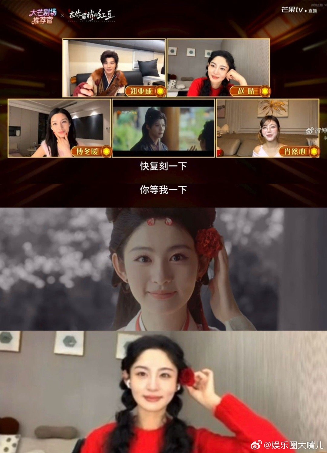赵晴直播自带花callback名场面 剧里沈谬为绛朱戴上红花,她教他看见颜色;剧