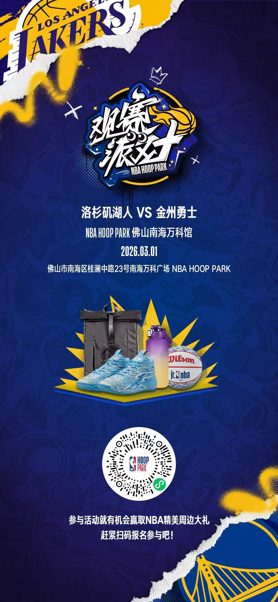 7城联动(天津上海成都西安杭州南昌佛山),NBA HOOPPARK邀请您线下观看湖勇大战,就在明天,6千万吊打2万万,扫码报名,奖品多多,欢迎来进货!nba勇士vs湖人金州勇士
