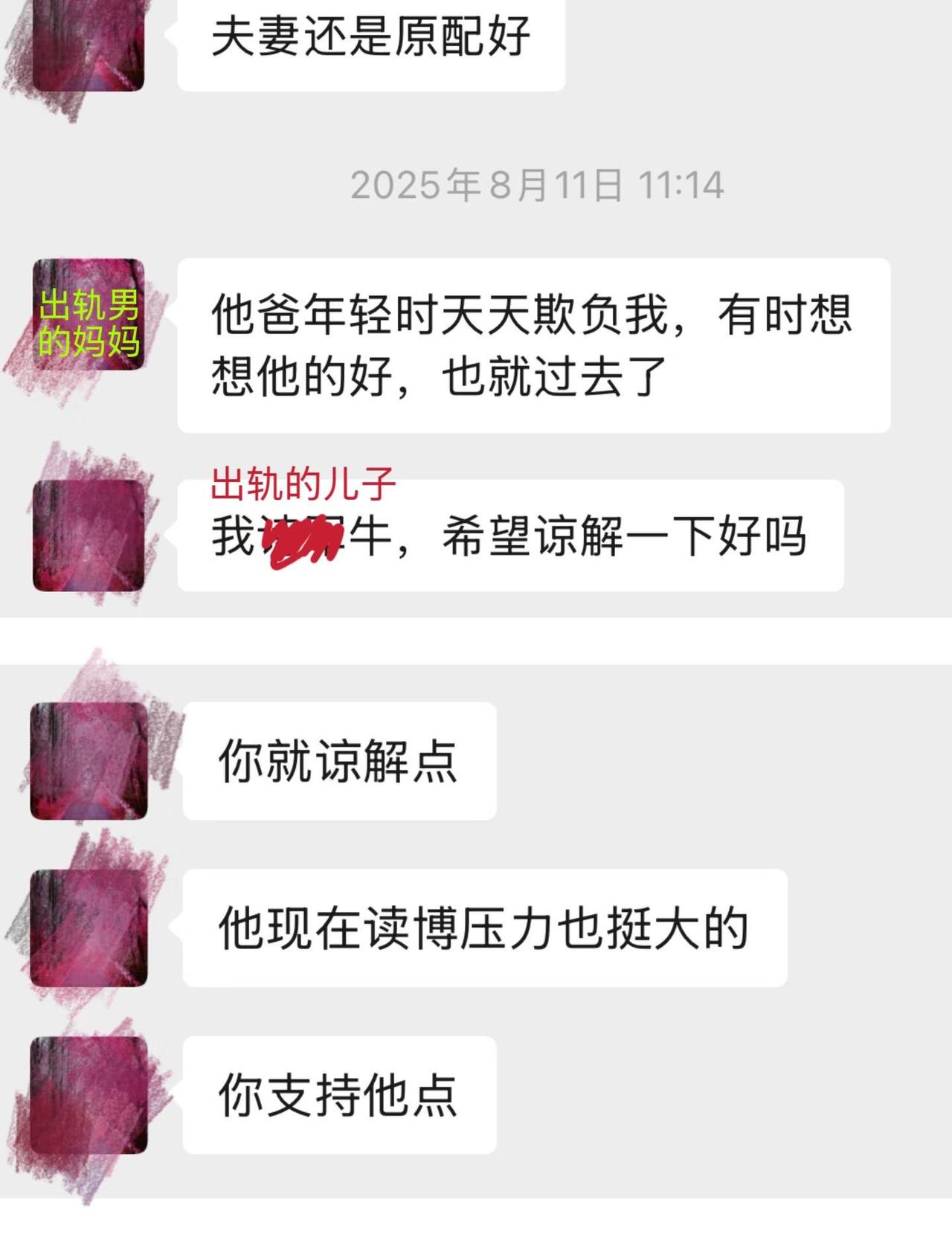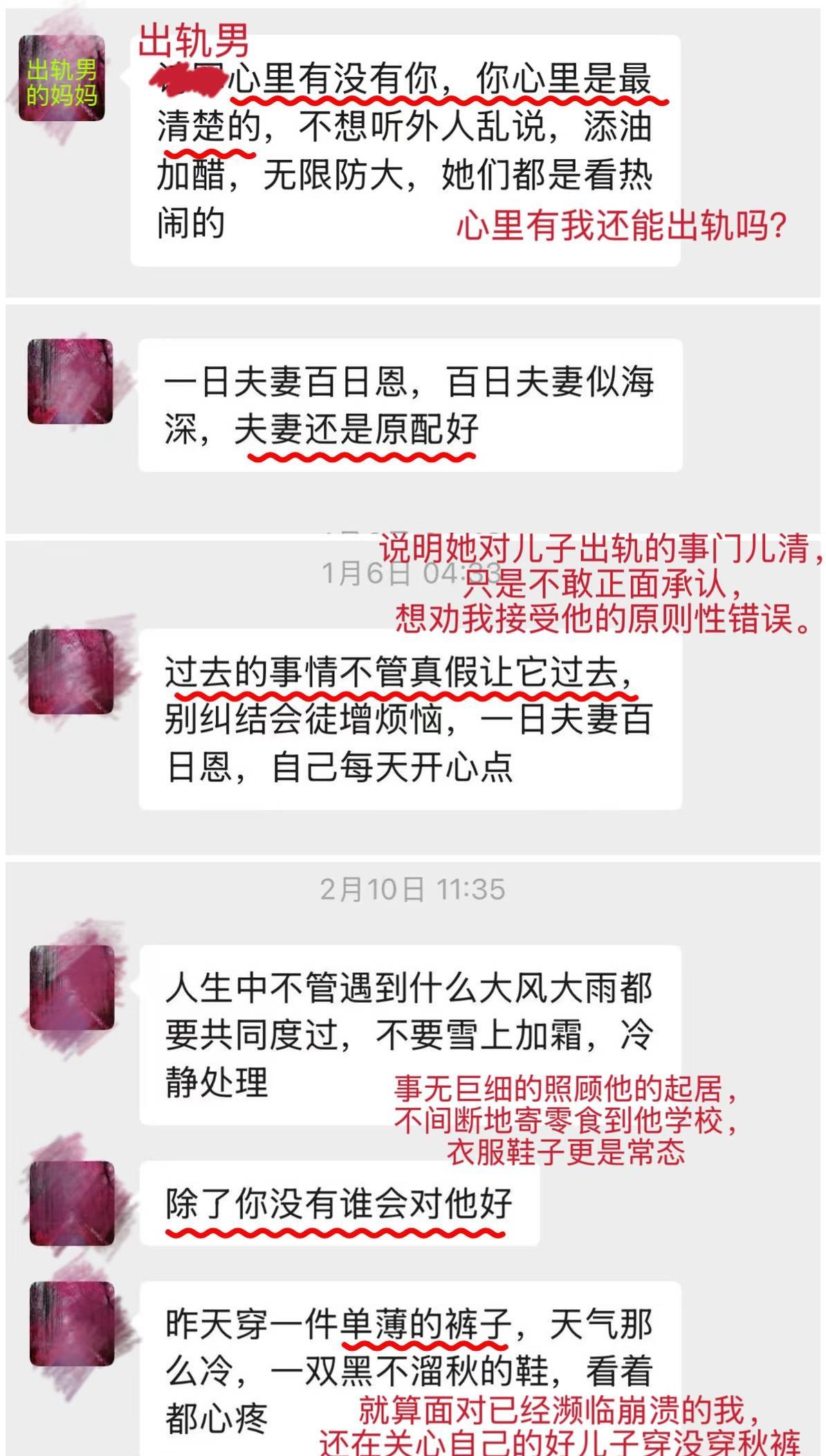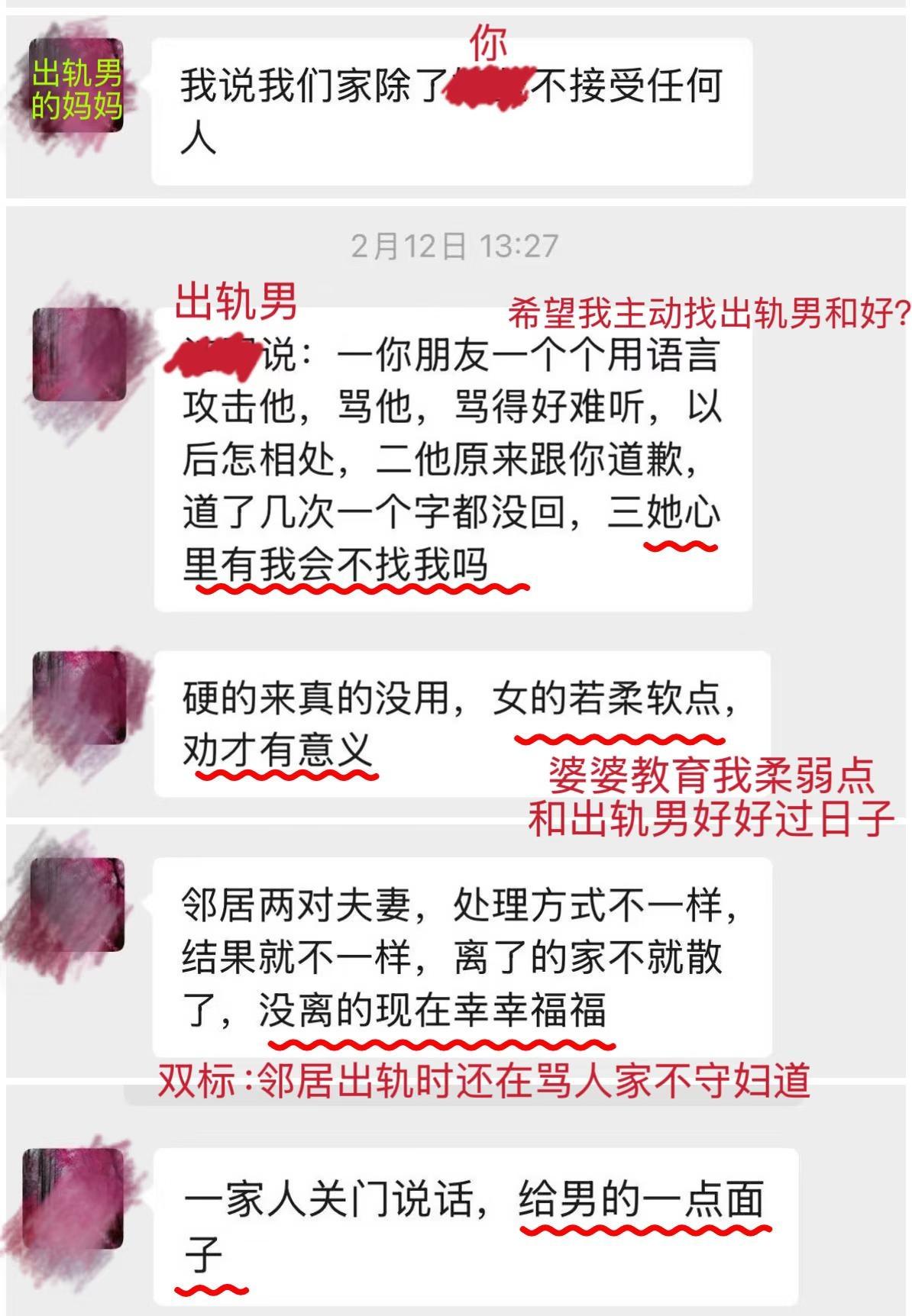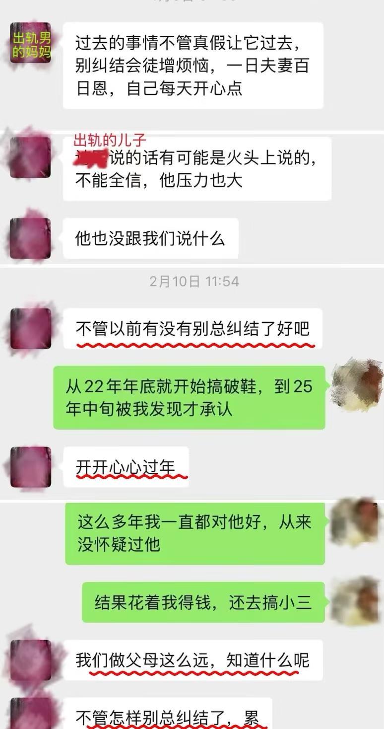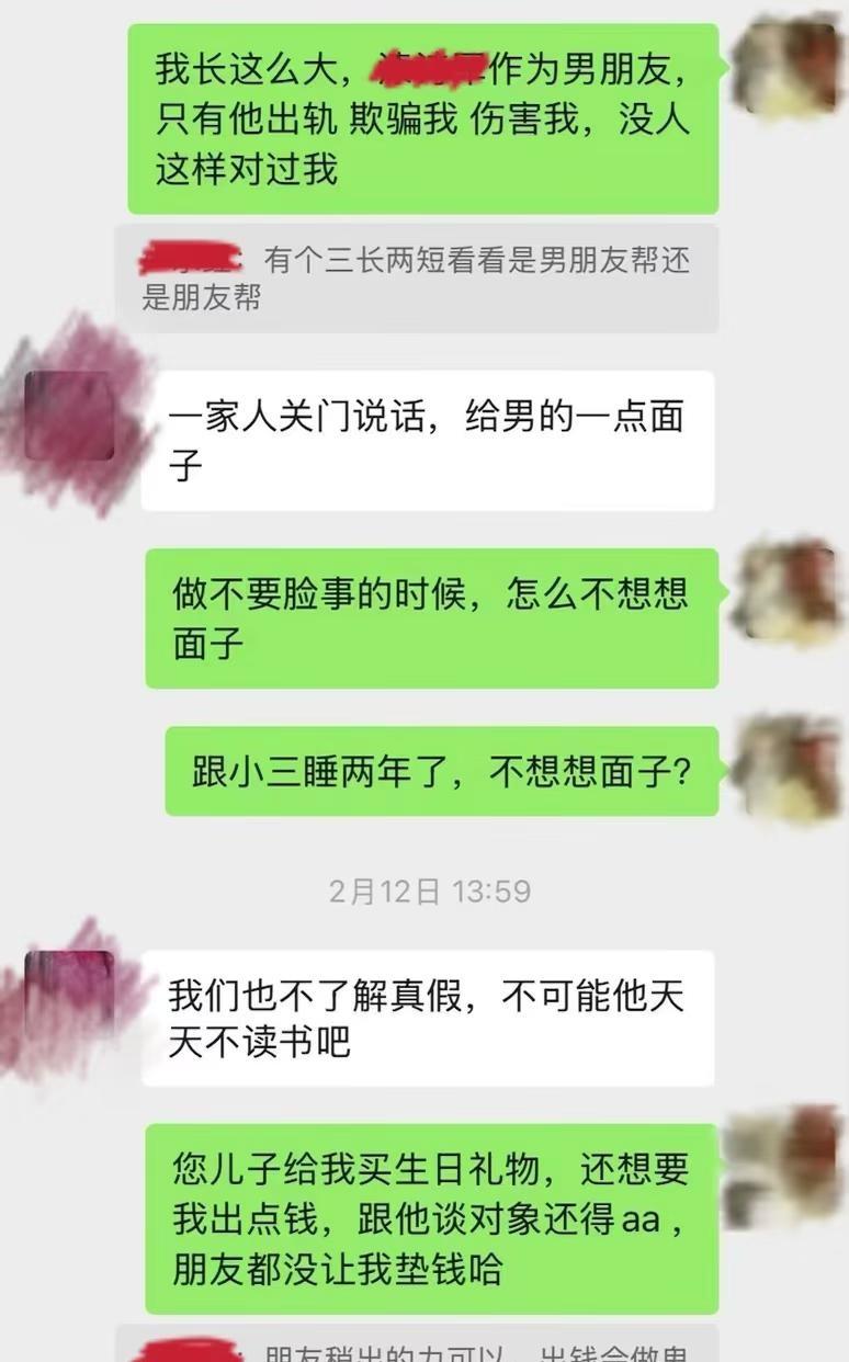 准婆婆说,男人出轨是因为我不够柔软 又失眠了,深夜睡不着又开始想这件事。 我与天*大学在读博士从15年开始恋爱十年,22年开始异地,24年订婚,但后来才发现,刚开始异地那年他就出轨了。 出轨暴露后,即使他供认不讳,他家人依旧咬死不认,说是我太强势导致男方压力太大,为了不耽误我,这才被迫承认自己出轨。就算面对已经濒临崩溃的我,还在关心自己的好儿子读博压力大、穿没穿秋裤,面对我时就只想翻篇,即使在我明确表示需要道歉后,她只是说“不管以前有没有别总纠结了”,后来又改口为不了解真假。 既然她能说出“不管以前有没有”,说明她对儿子出轨的事门儿清,只是不敢正面承认,想劝我接受他的原则性错误。 这几年我们的点滴朋友都看在眼里,忍不住替我出头。而他一声不吭,转头让妈妈过来抱不平,他妈说我朋友说话难听,不给他面子,还教育我作为女人应柔软点,遇到难事不要告诉朋友,关起门来偷偷跟她说就好。 她说遇到三长两短看是男友帮还是朋友帮,有钱才是朋友,没钱什么都不是。这些话冲刷着我的认知,原来即使同为女人也能这样不明是非,颠倒黑白。我不知道朋友究竟能帮我多少,但绝不会在我生日送我2000多的iPad,转头要我报销600。过年一起回我家,我买了两人高铁票,去他家时,让我陪他凌晨坐12个小时的硬座火车。 他妈来劝我时说“除了你没有谁会对他好”,是啊,曾经我事无巨细的照顾他的起居,不间断地寄零食到他学校,衣服鞋子更是常态。我体谅他学习累不想出门,就几乎不出门约会,陪他宅家打游戏。 他妈说“我们家除了你不接受任何人”,可在两家商量订婚事宜时,我操心操力,他半推半就。我是万万没想到,这人玩了一手两面派。一边瞒着自己家里人,谎称吃个便饭,一边哄骗着我筹备着订婚。不对,是三面派,那边还出着轨。 他家一直把三金彩礼挂嘴上,却从不提具体金额和时间。我家人千里迢迢赶去江西筹办订婚,受到的却是他家人不解的眼光。后来他哥说江西不搞订婚,当年没给妻子搞,现在弟弟搞不仅让他很难堪还把他家搅得不宁,并把这一切归结到我头上,说我太强势,他弟是被我逼的。但从始至终我也被蒙在鼓里。在他家,男人怎么会有错呢? 发现他出轨已半年了,他家没有任何诚恳的道歉,满口放下和谅解,十年感情我已把他们当成家人,现在才发现是我一厢情愿 原以为我拥有校服到婚纱的幸福婚姻,谁能想到变成这样,不知道未来的路如何走下去 江西彩礼 天津大学